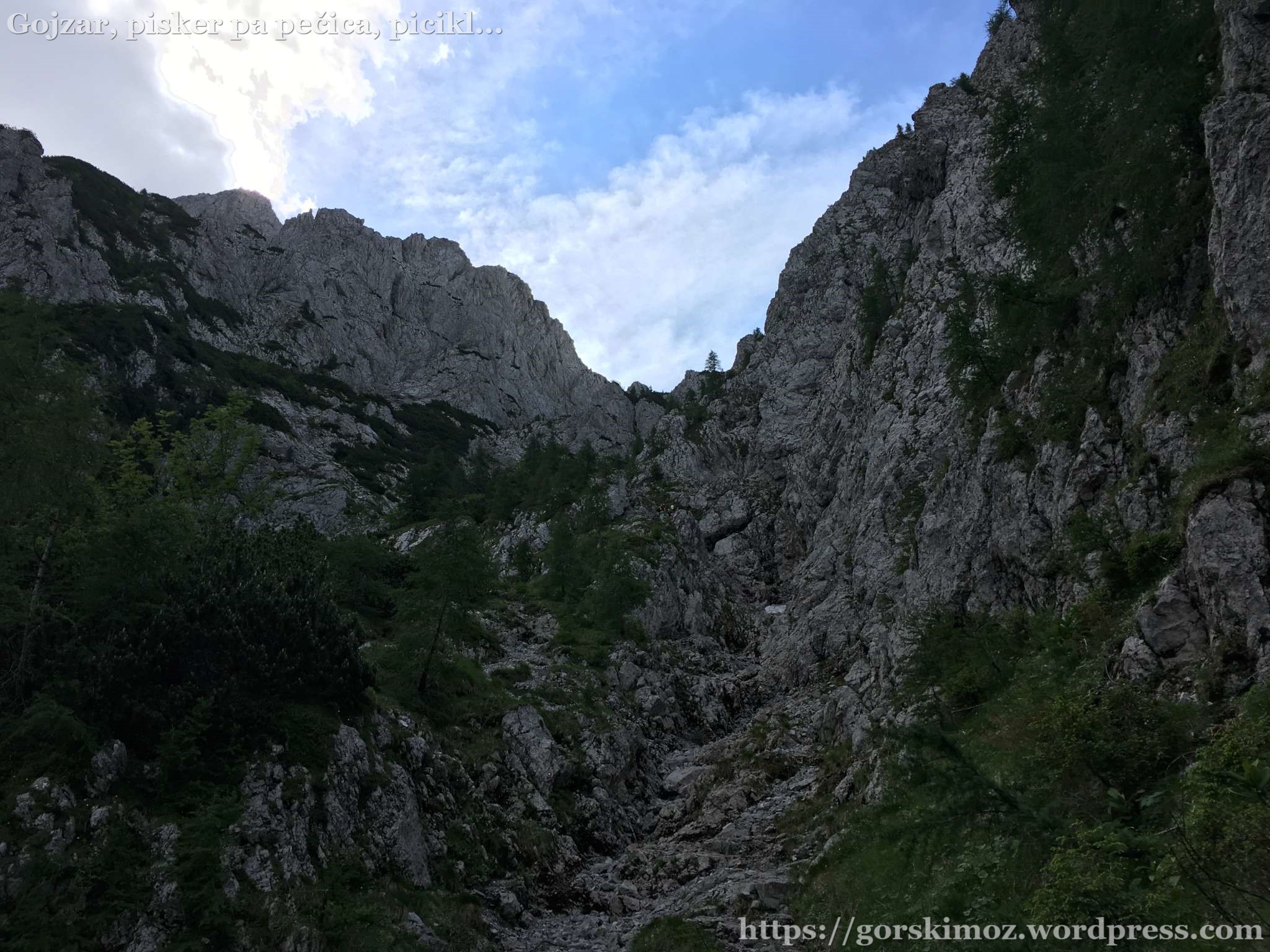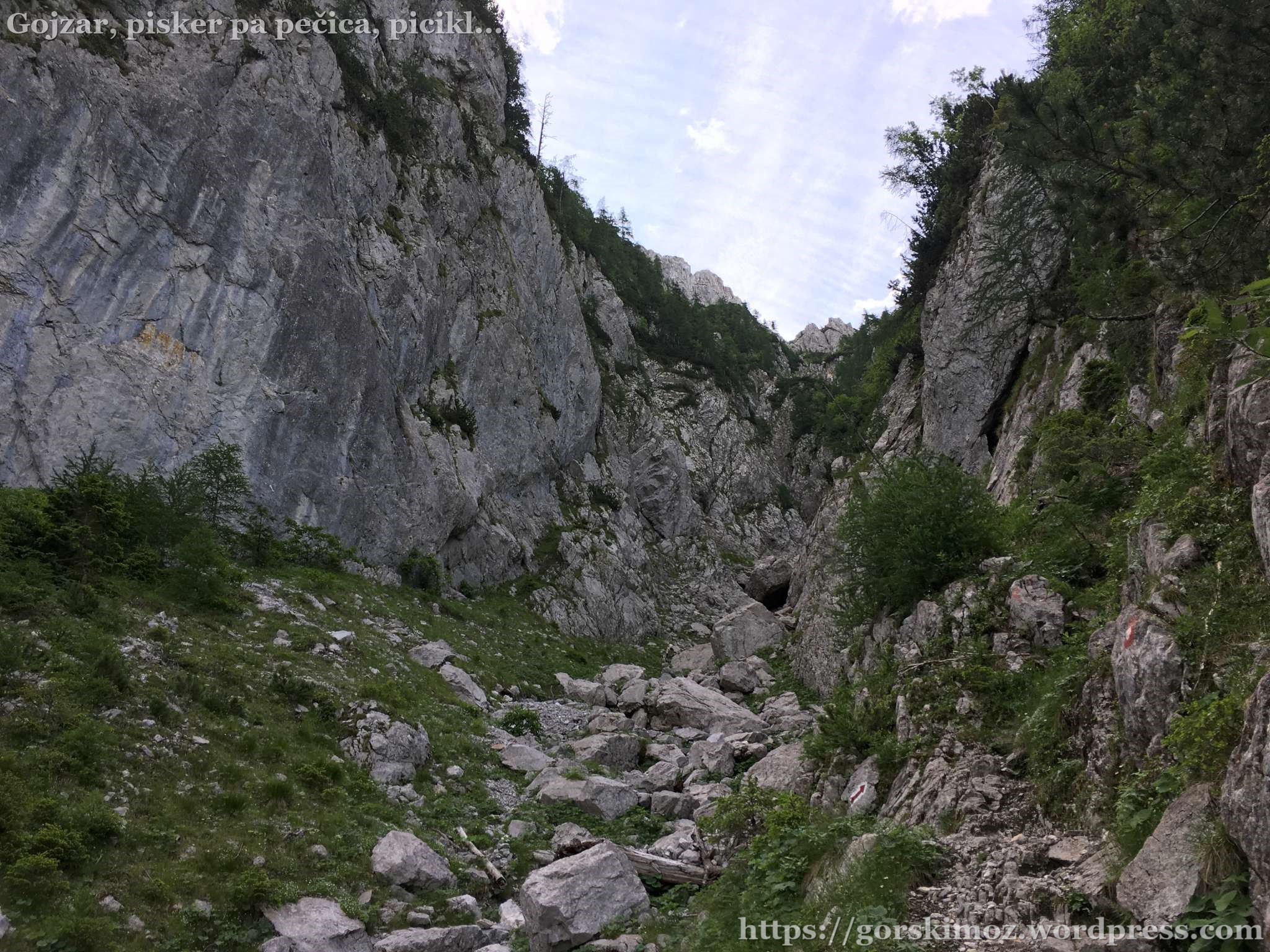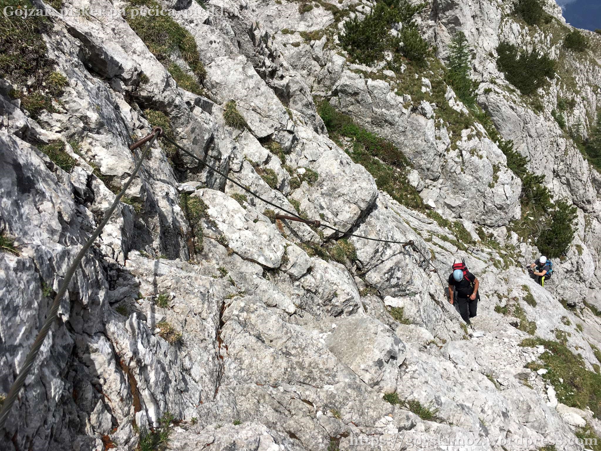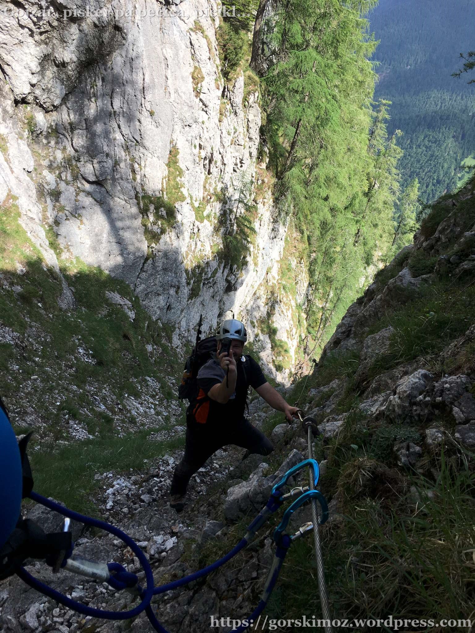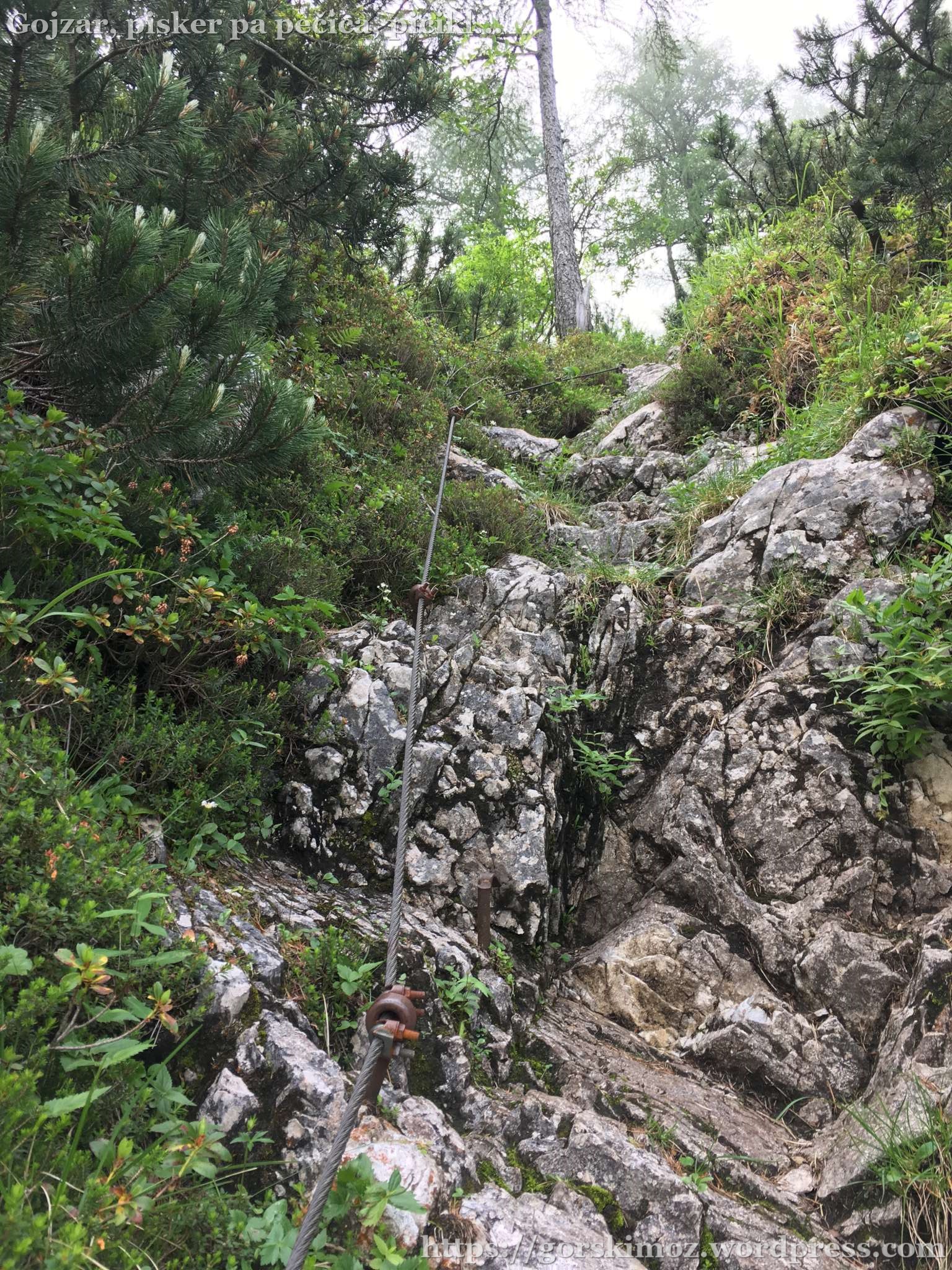 Pot je lepo zavarovana z jeklenicami in klini, kamnina pa je kar krušljiva.