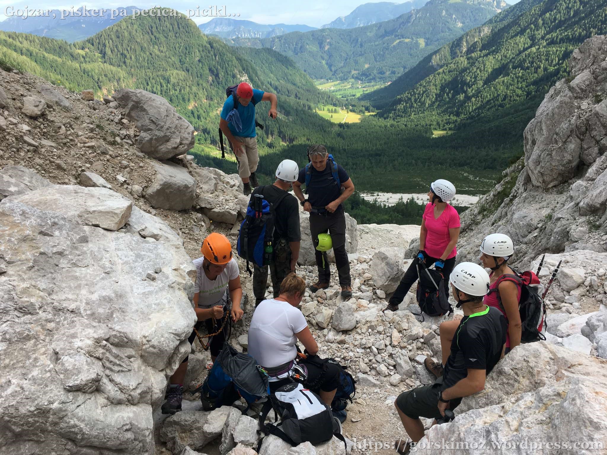 Pot do žičnice, skozi gozd in po melišču je hitro minila in pred vstopom na zavarovani del Slovenske poti smo si nadeli čelade in nekateri tudi plezalne pasove.