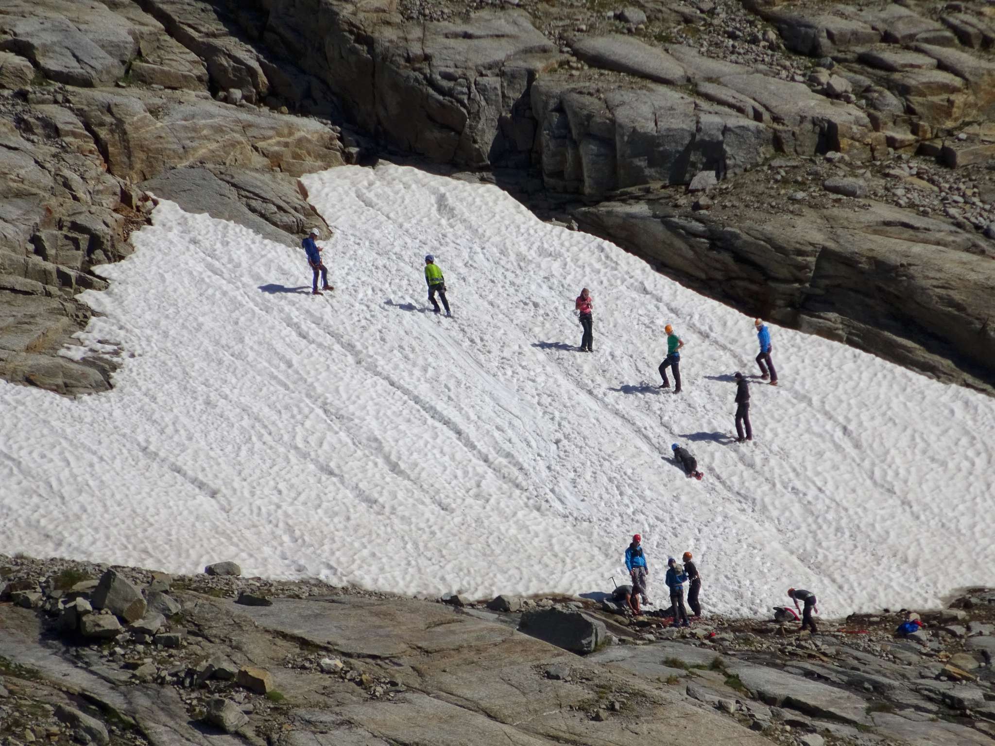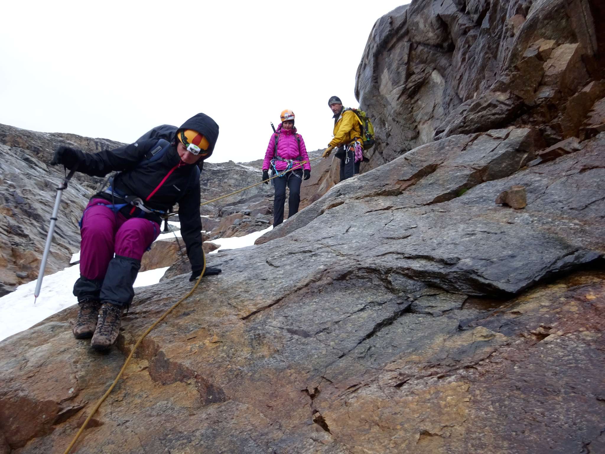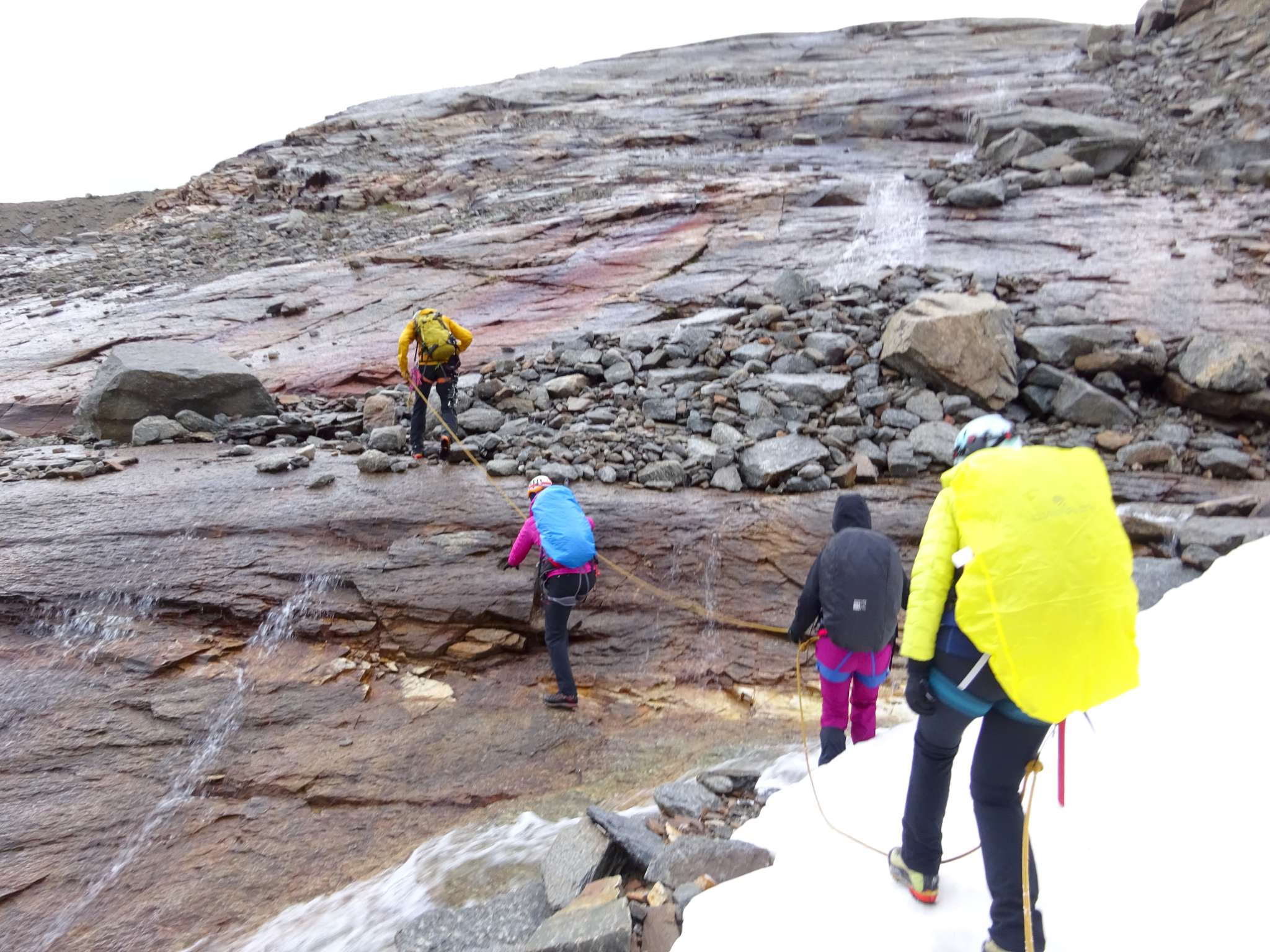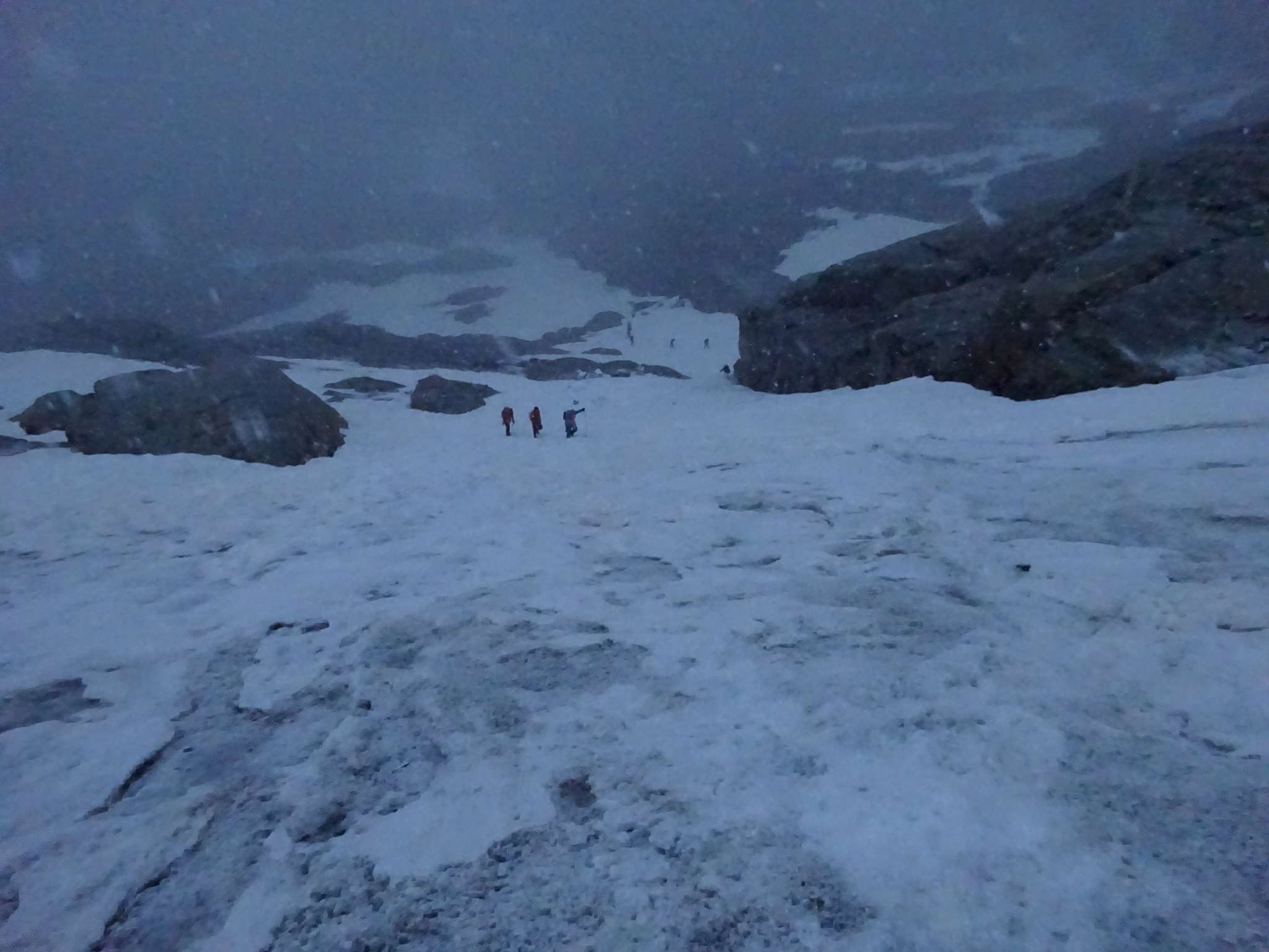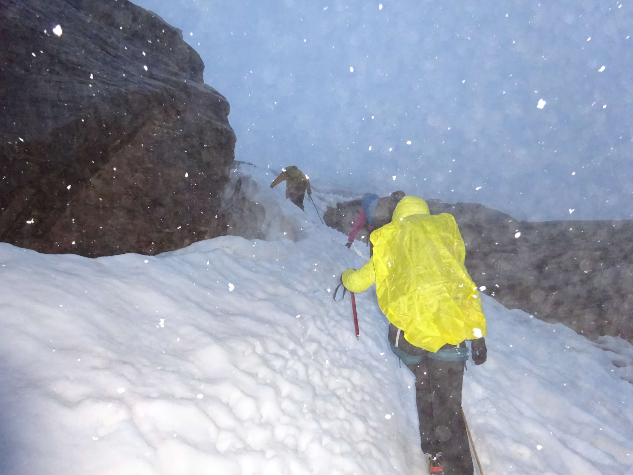 Kmalu dež zamenja sneg, začne tudi pihati. Vzpon po ledeniku je strm in hitro pridobivamo višino.