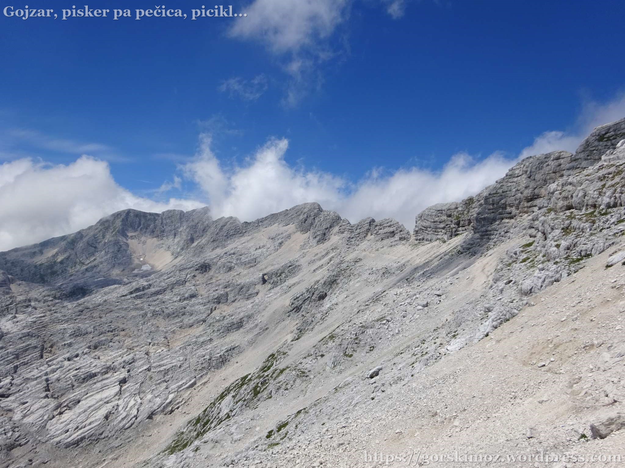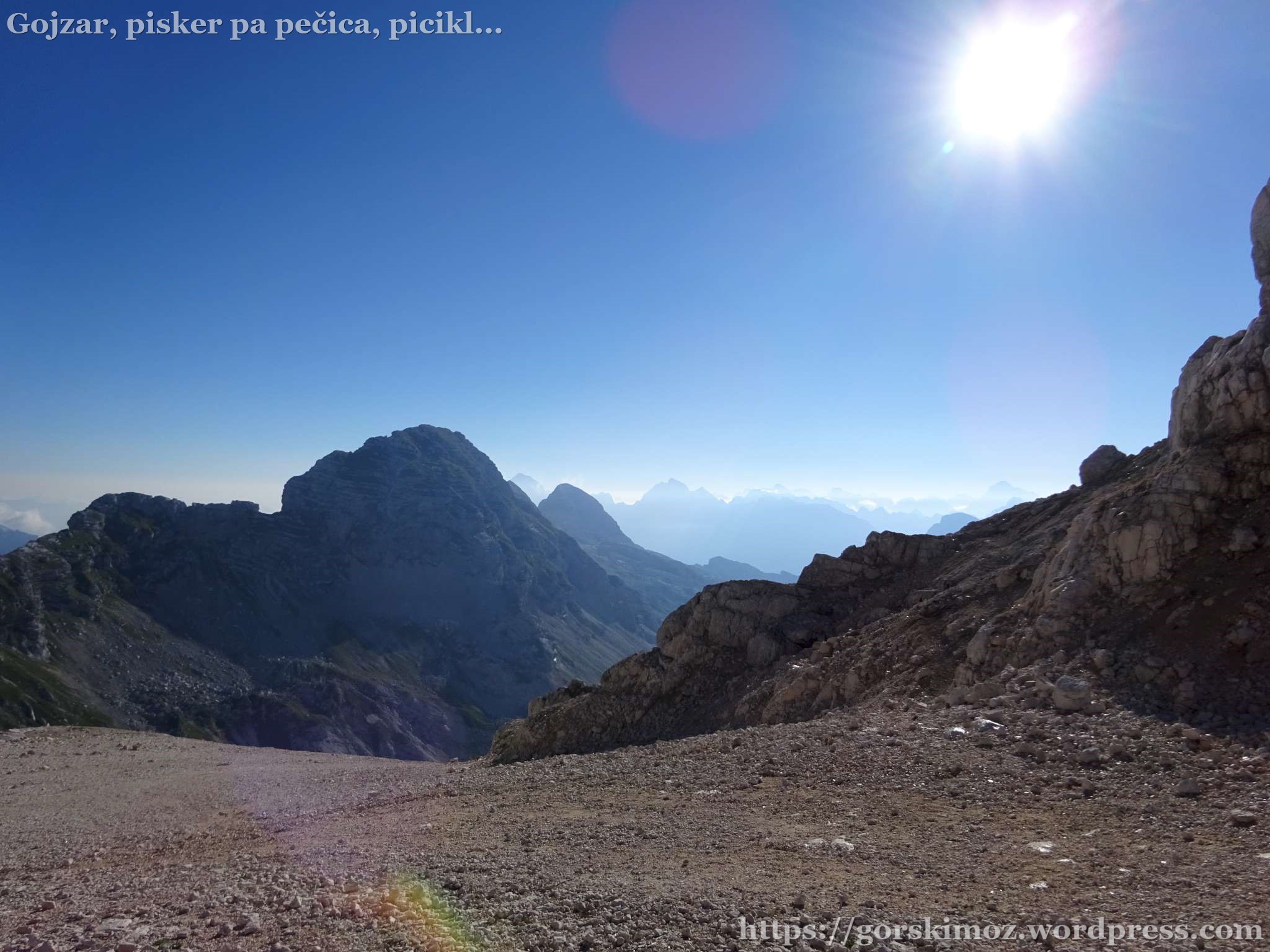 Na razpotju za Dom Petra Skalarja se ozremo na prehojeno pot čez melišča.