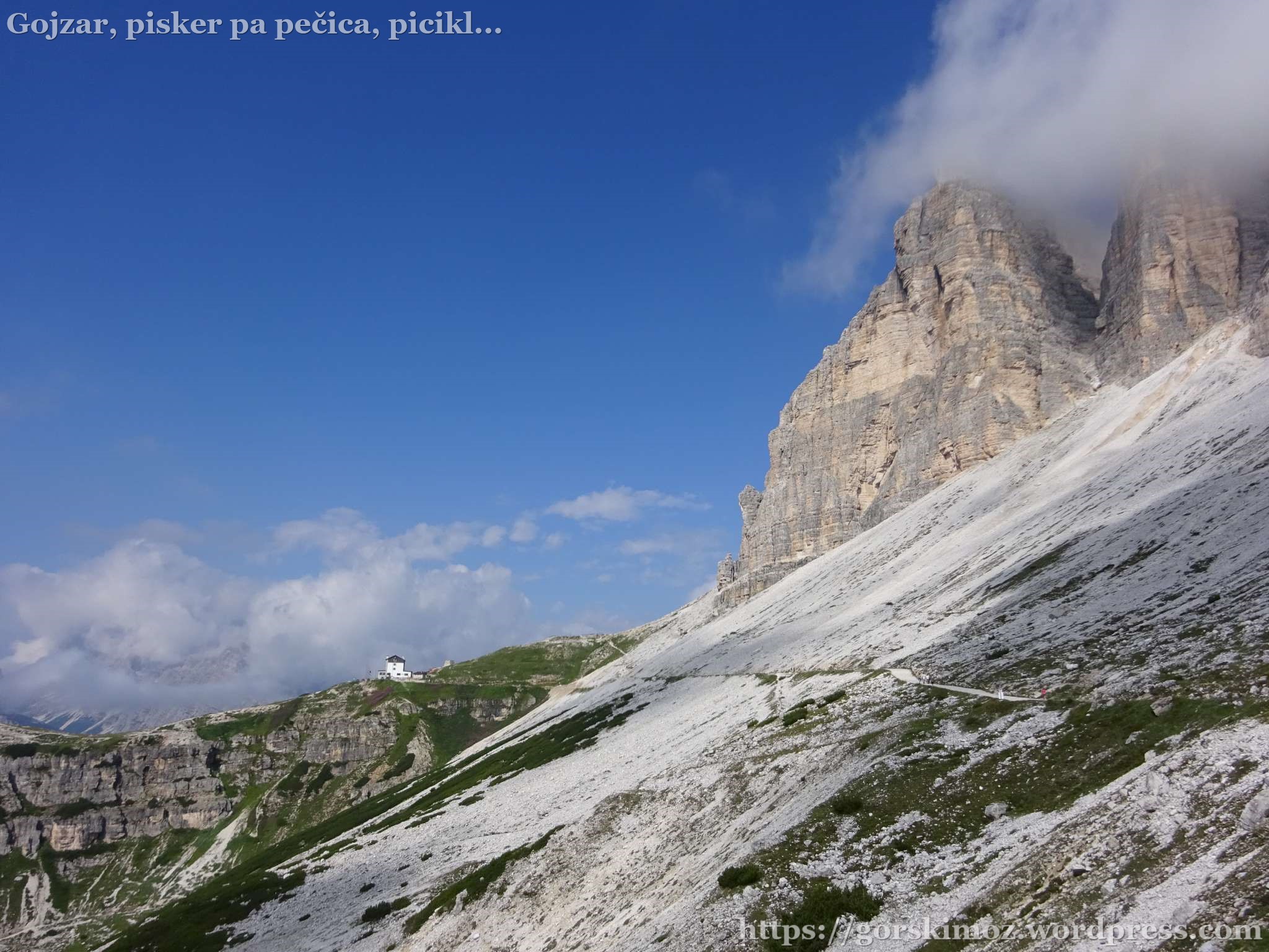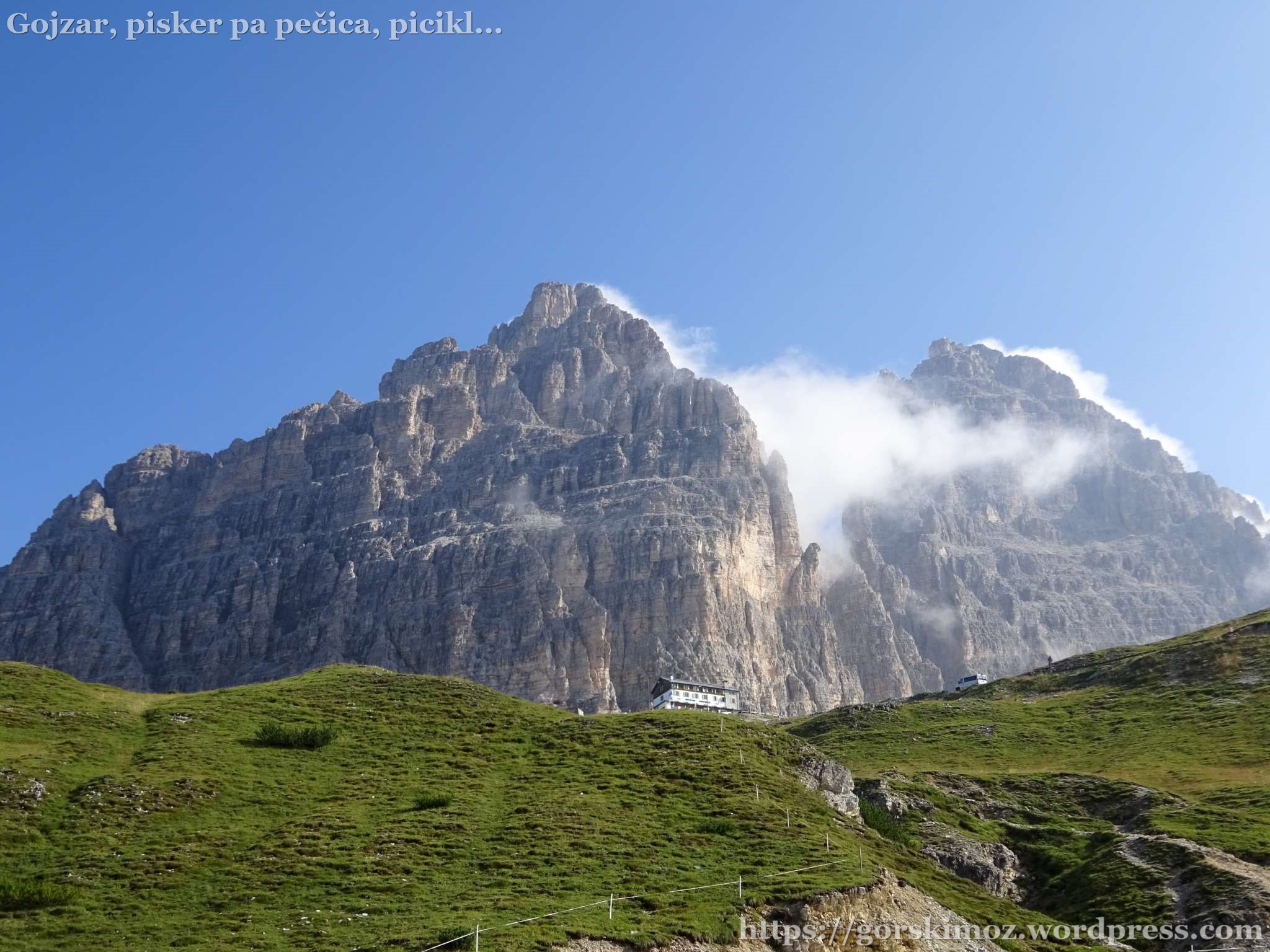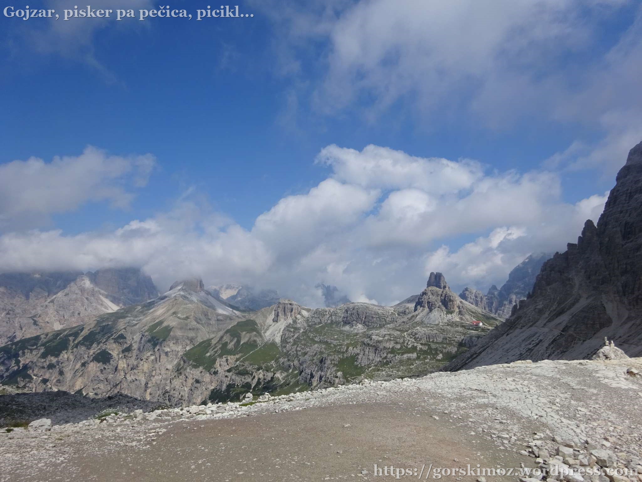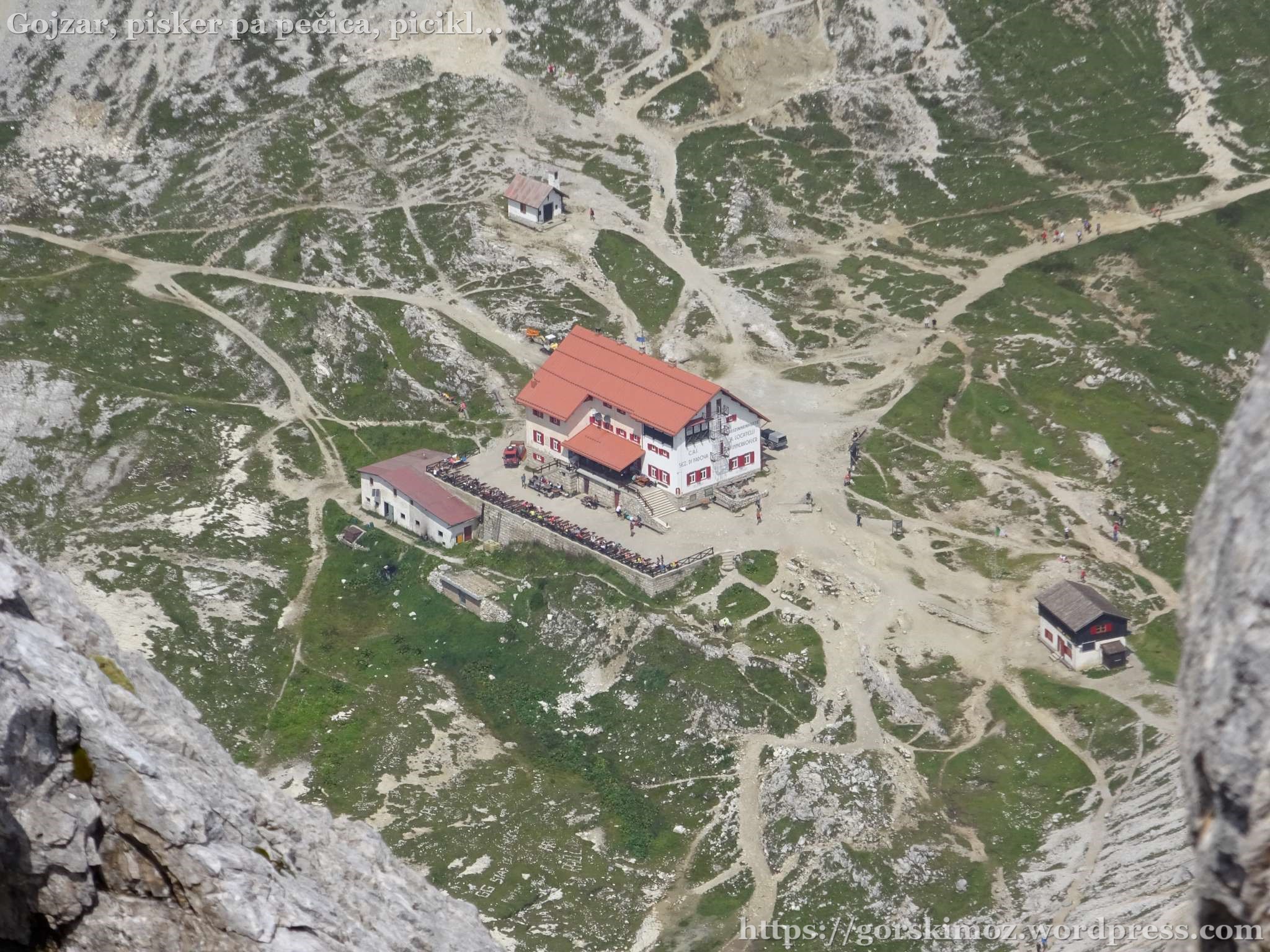 Pogled s sedla proti koči Locatelli (oz. Dreizinnen hütte).