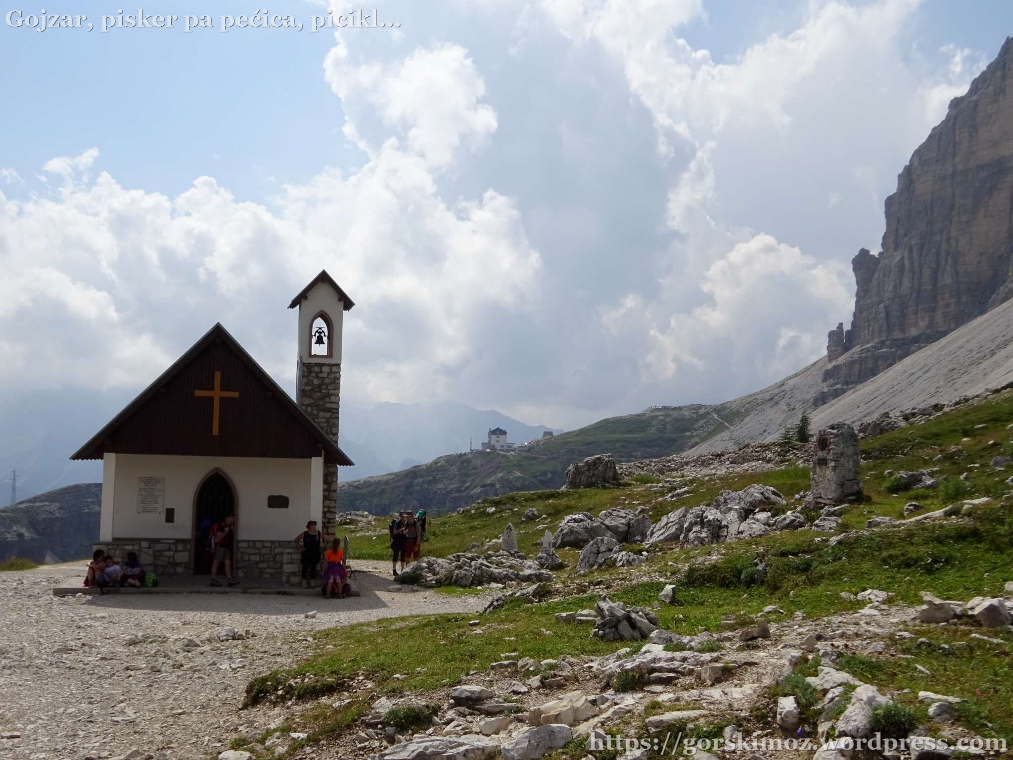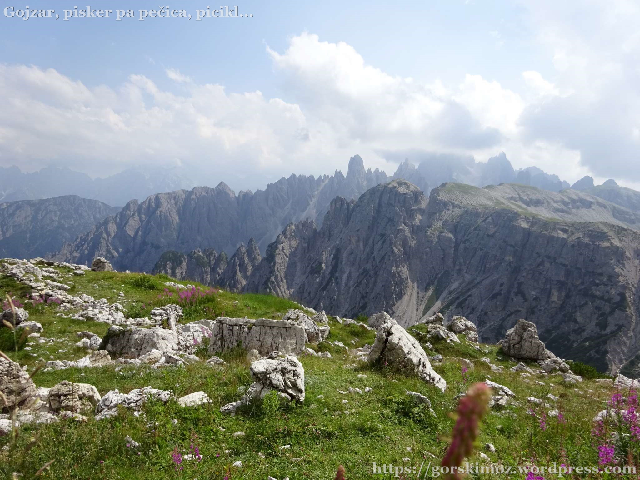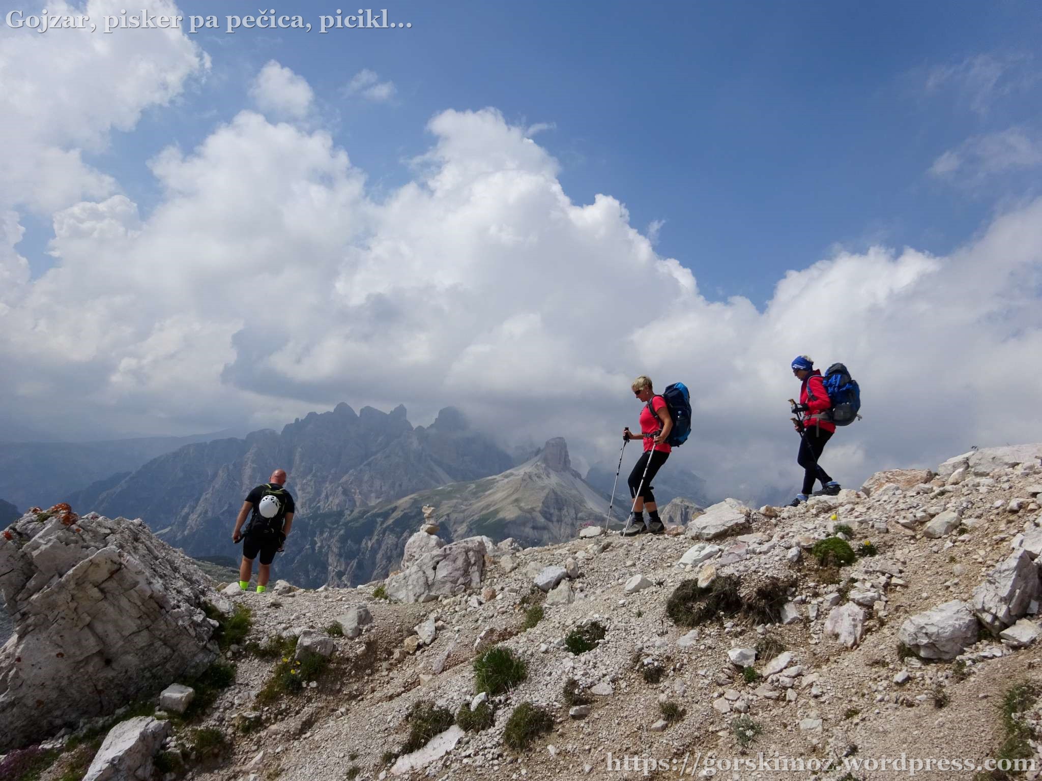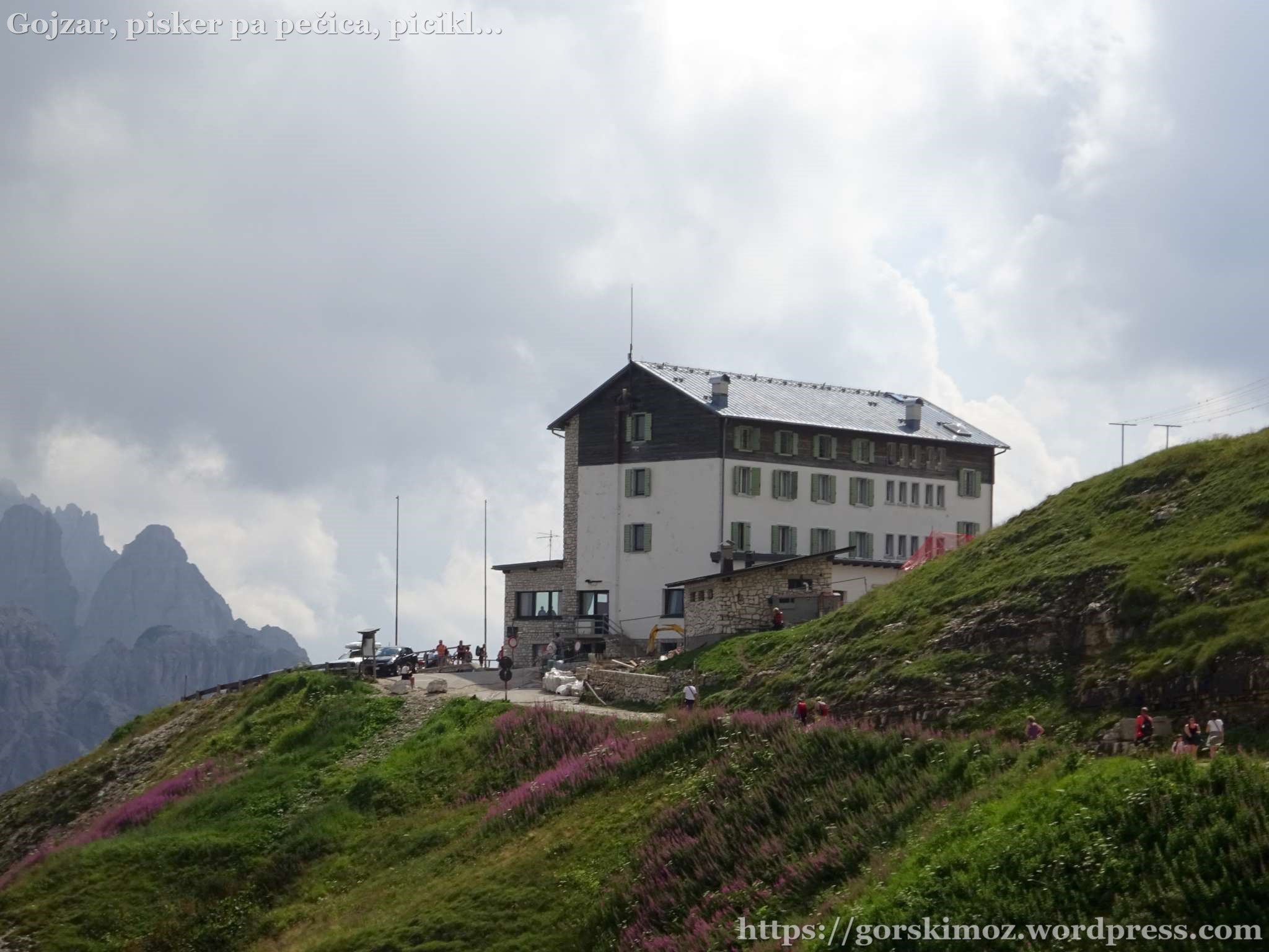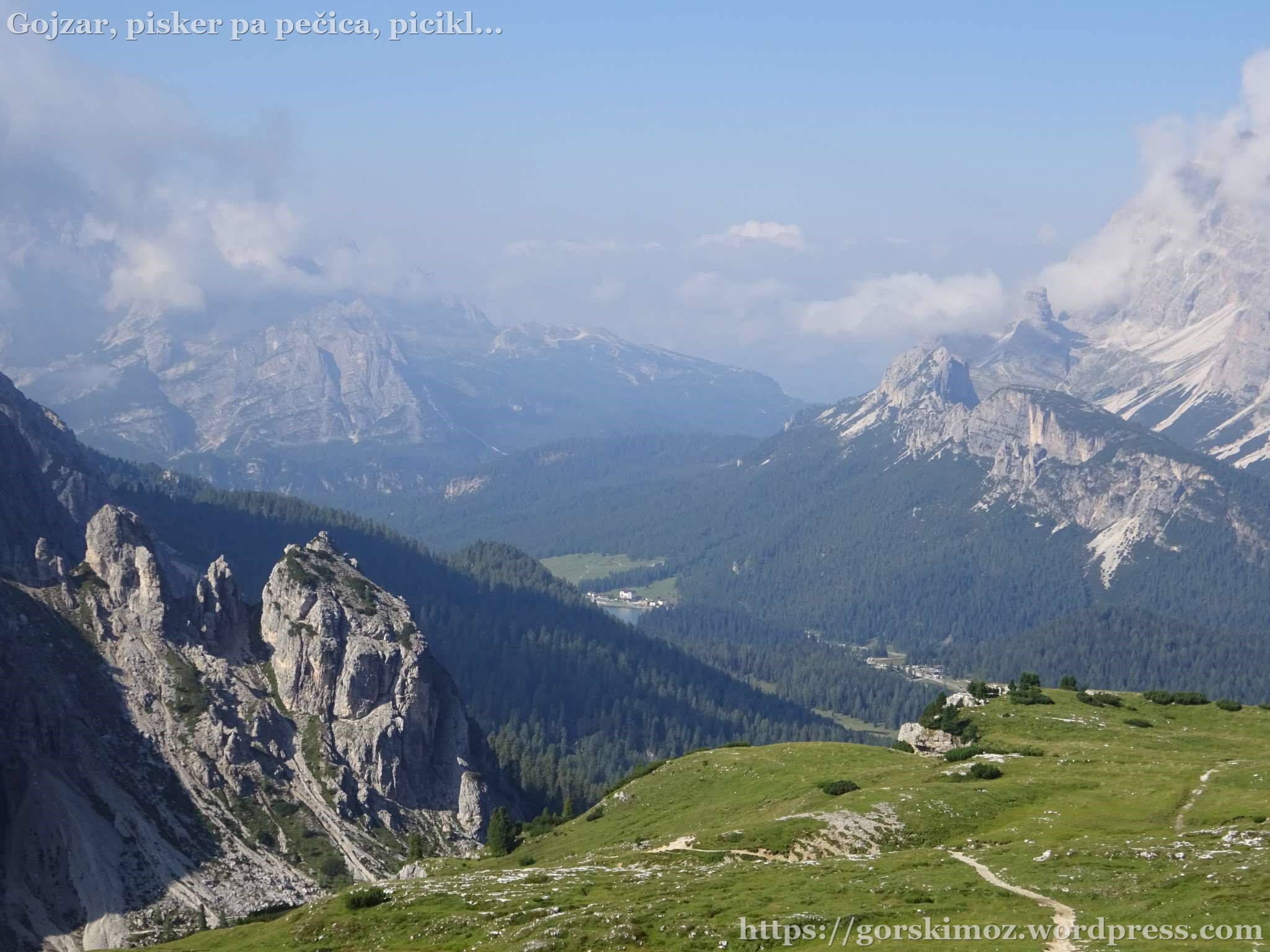 Pogled s sedla proti koči Locatelli (oz. Dreizinnen hütte).