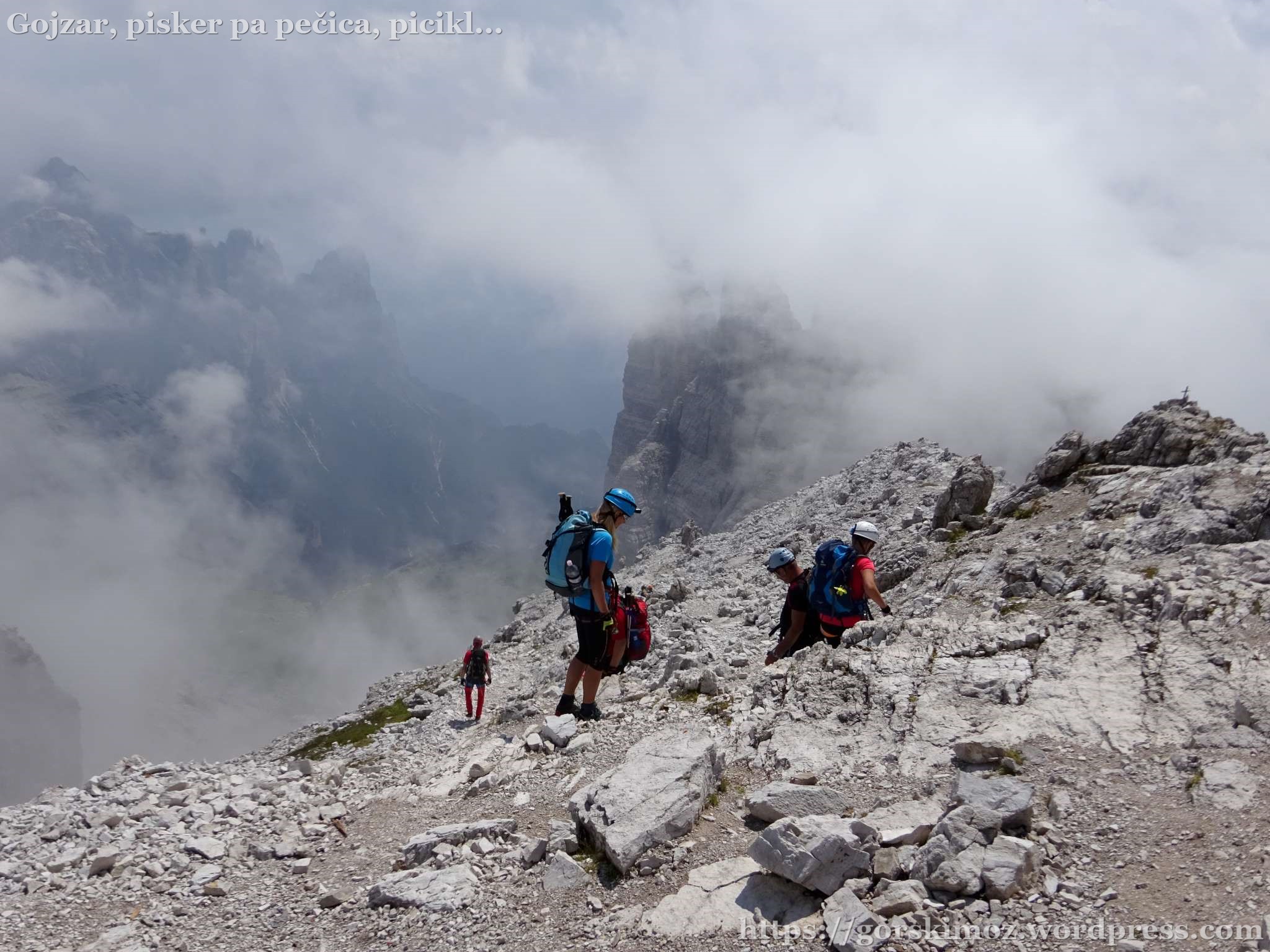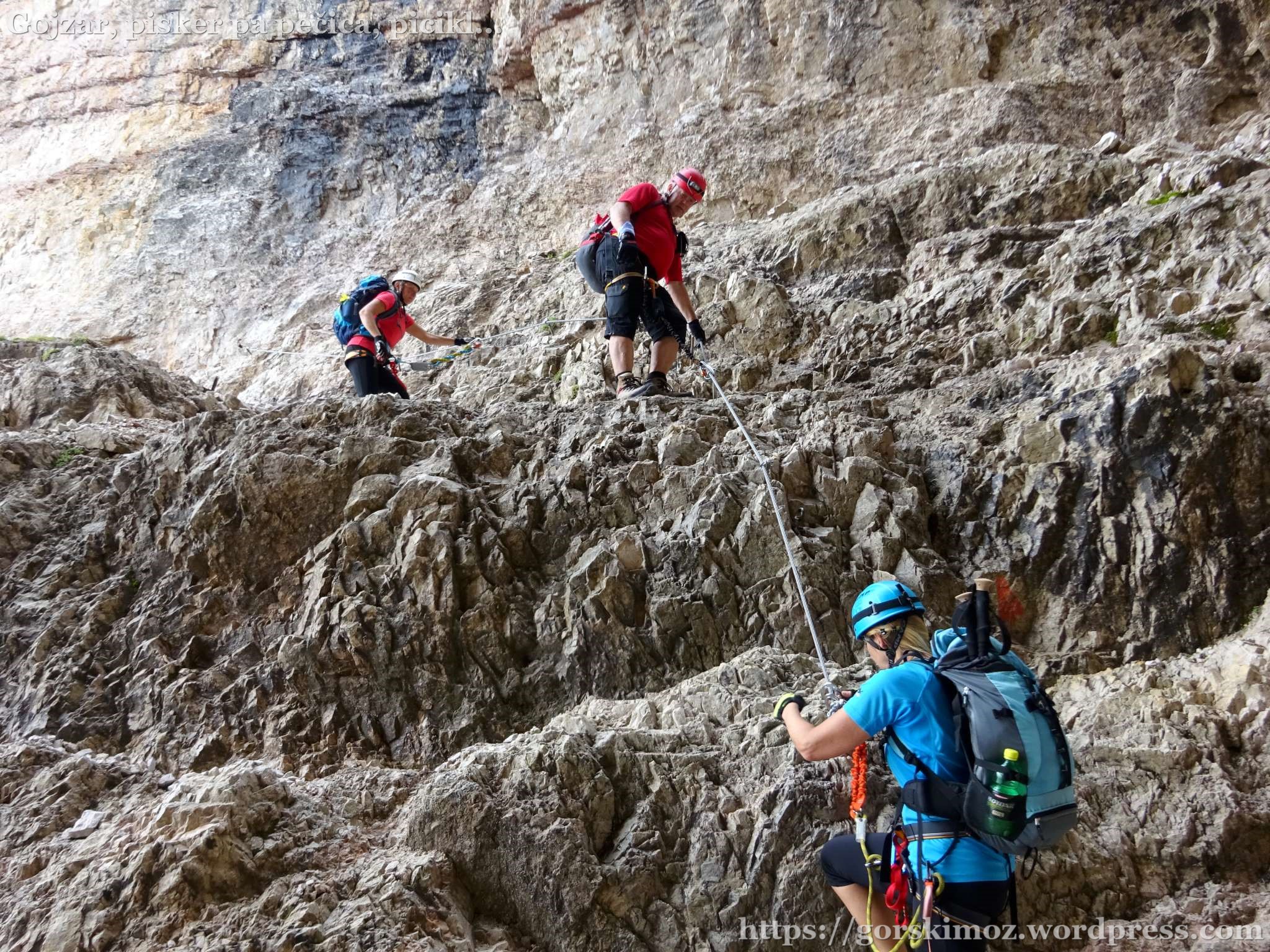 S sedla se odpravimo proti Monte Paternu. Nadenemo si plezalne pasove, varovalne komplete, čelade in čelne svetilke.
