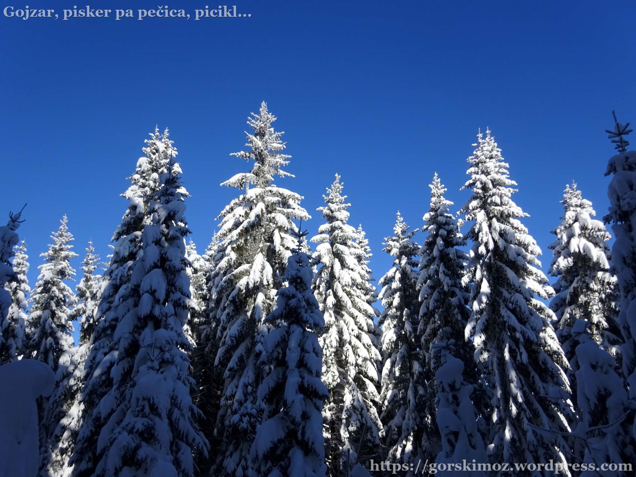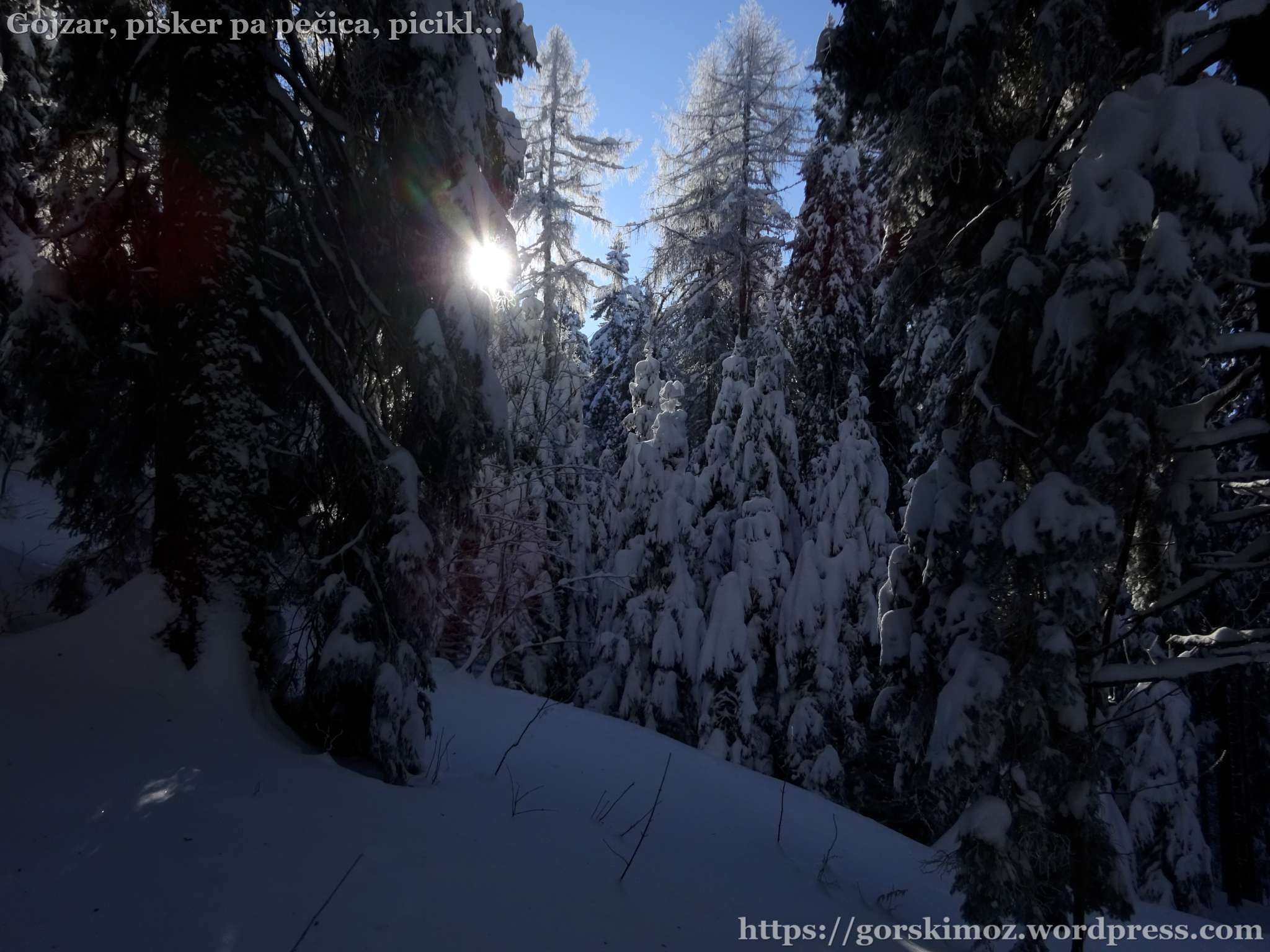 Bele smreke in obilica snega nas zvabijo na bližnjico.