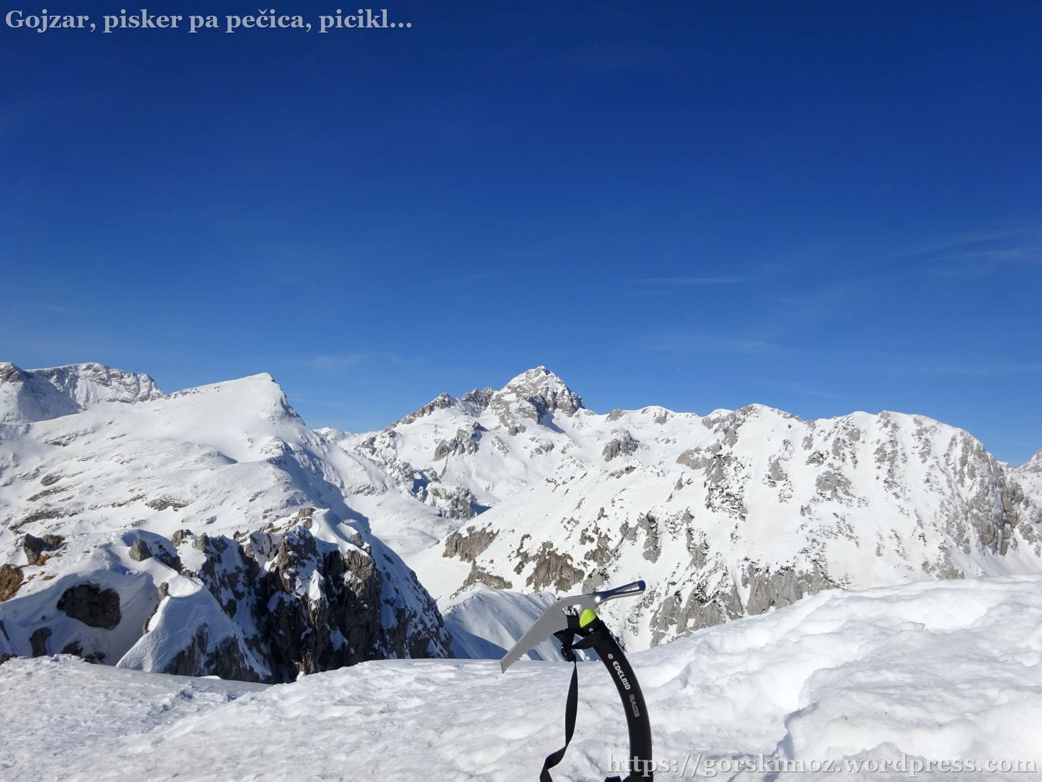 Izjemno strma in pomrznjena pot zahteva popolno zimsko opremo, zato si nadenem dereze in palice zamenjam s cepinom.
