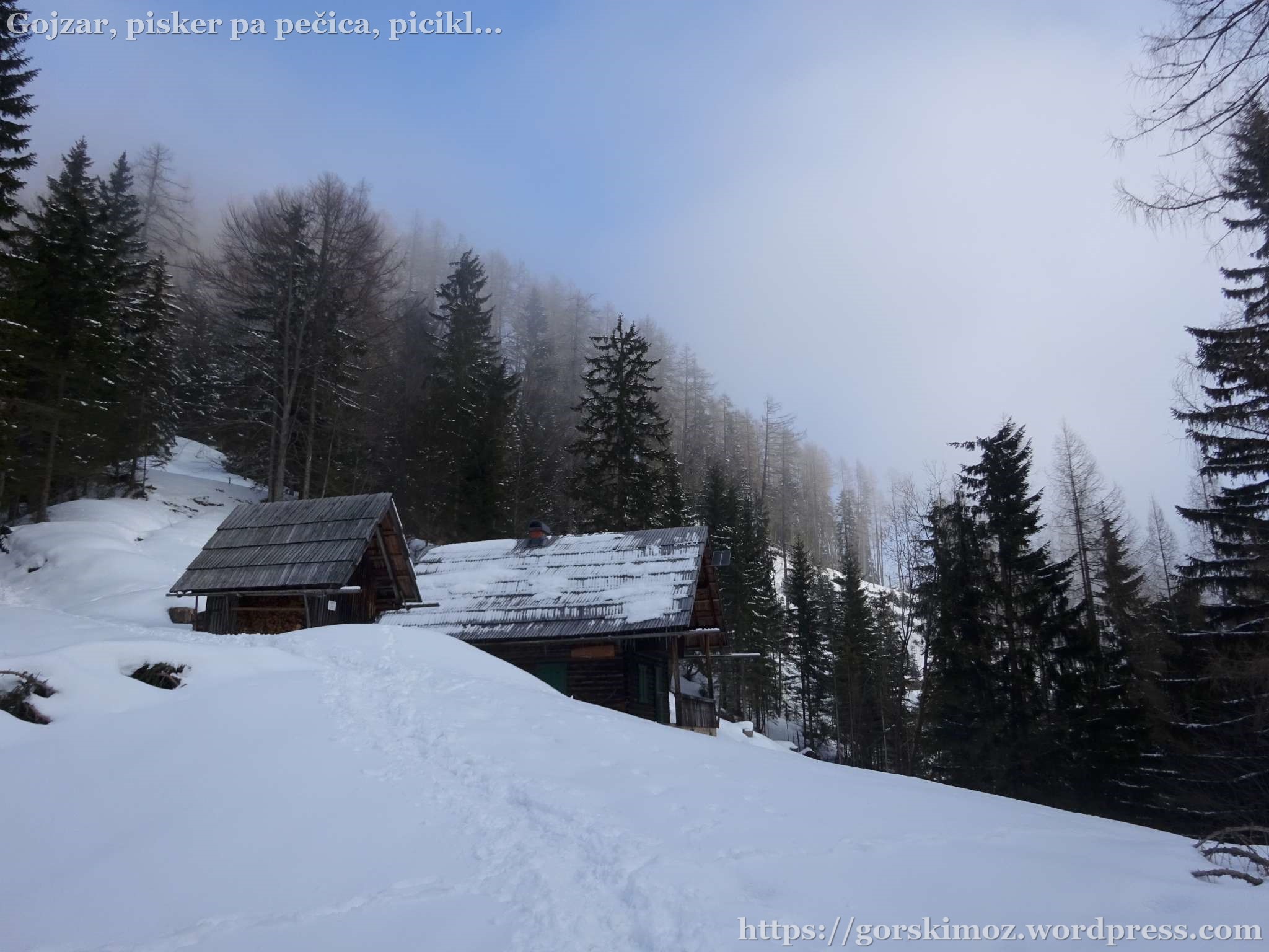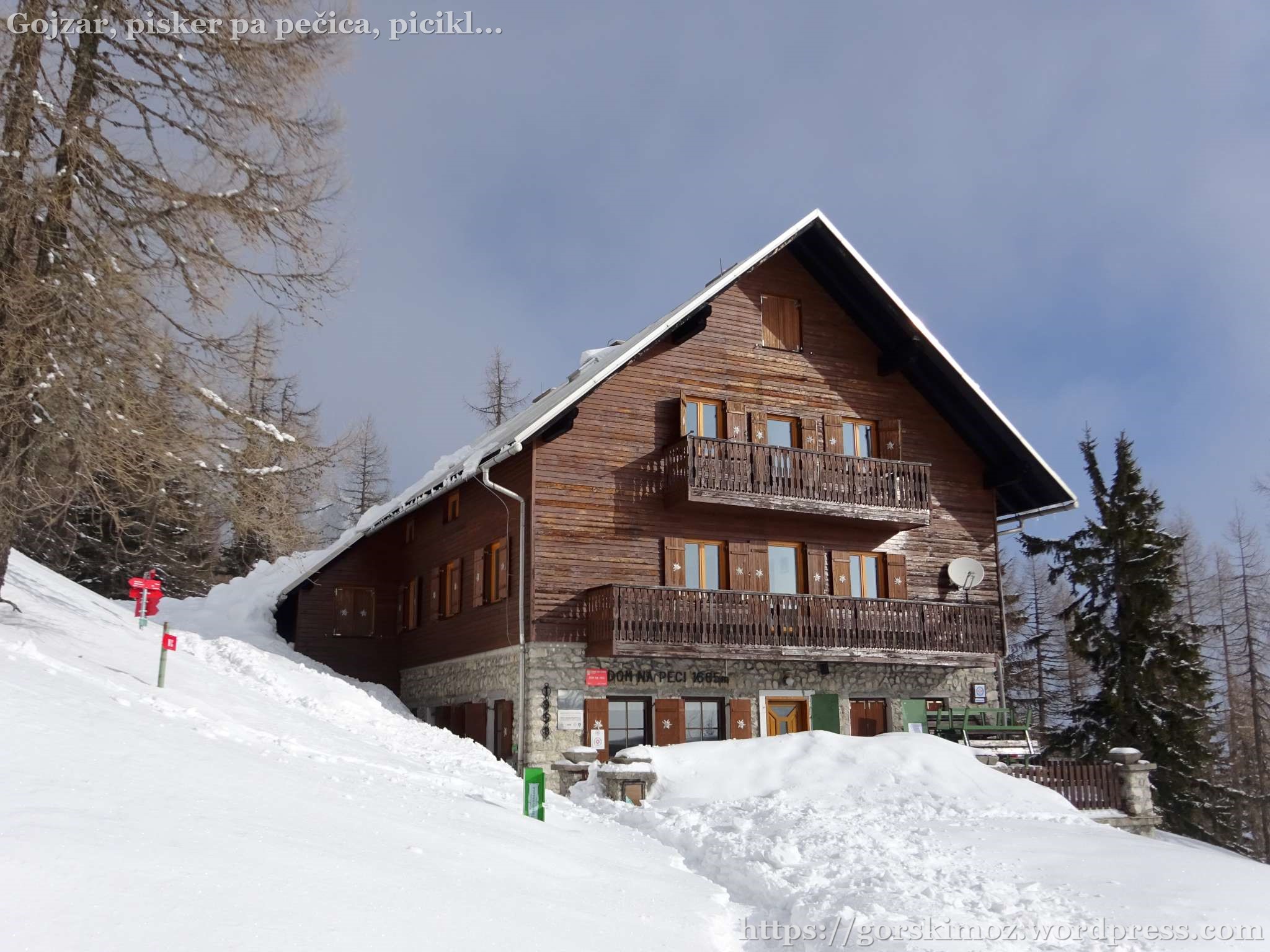 Koča na Peci je obdana z visoko snežno odejo,…