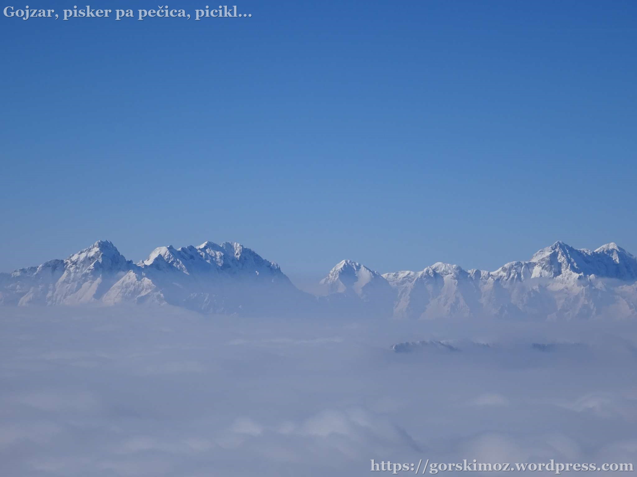 Osupljiv razgled na vrhove Kamniško Savinjskih alp nad morjem megle.