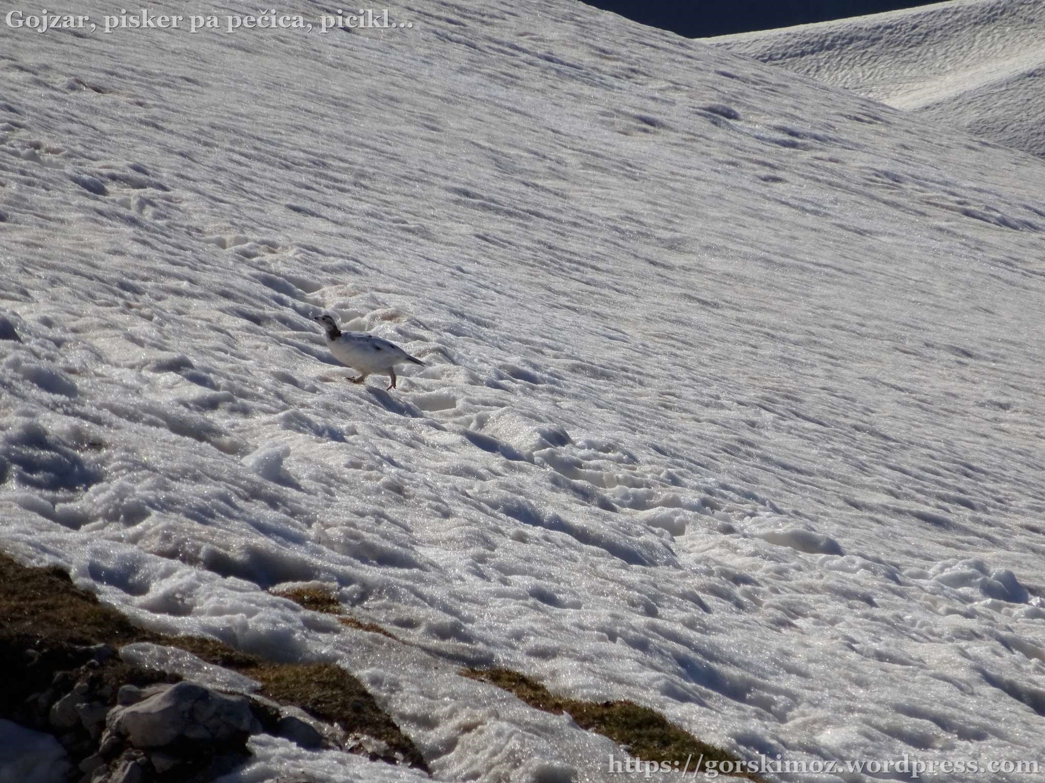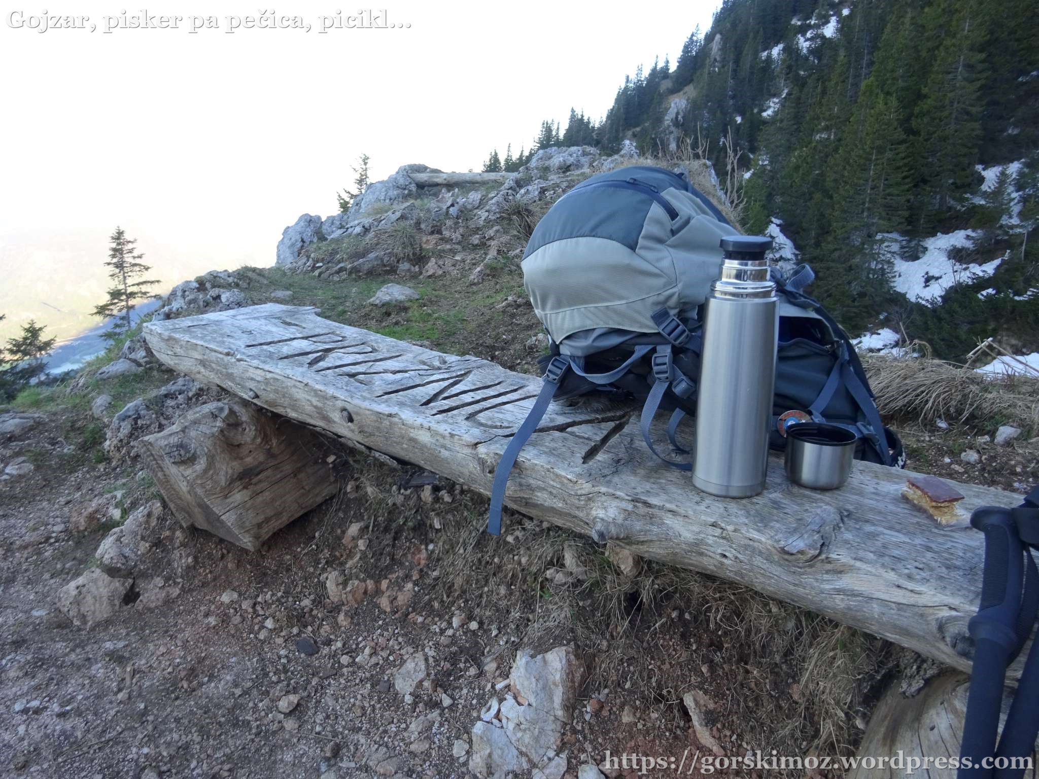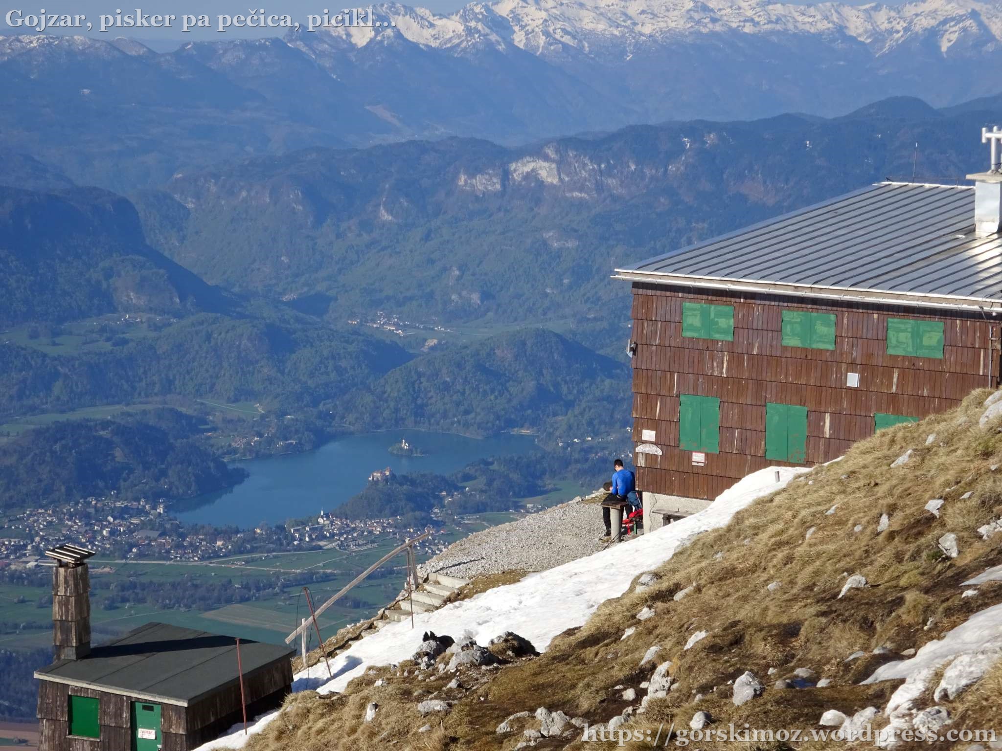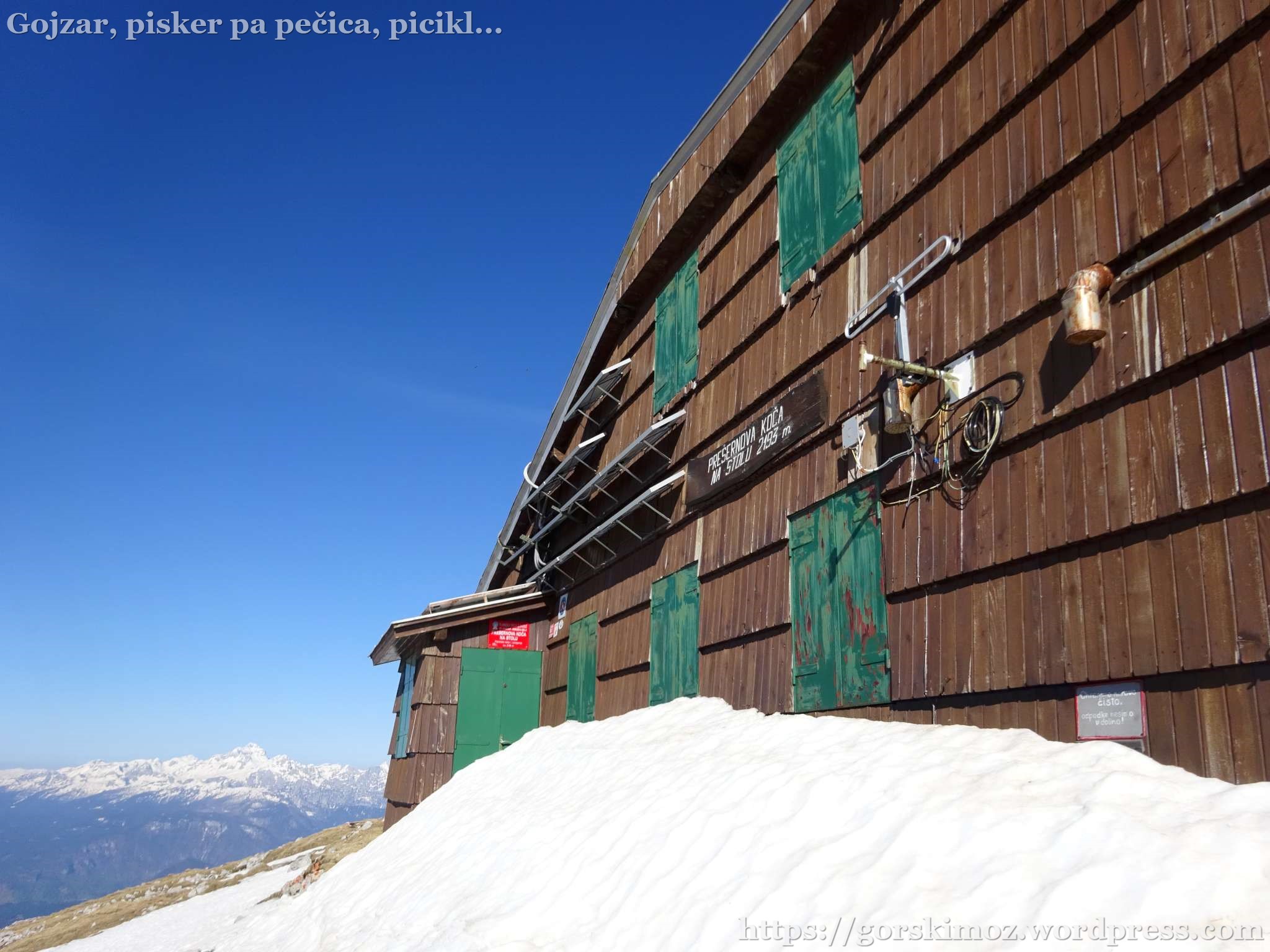 Klopi pred kočo se še pod snegom, vseeno pa se najde prostor za malico.