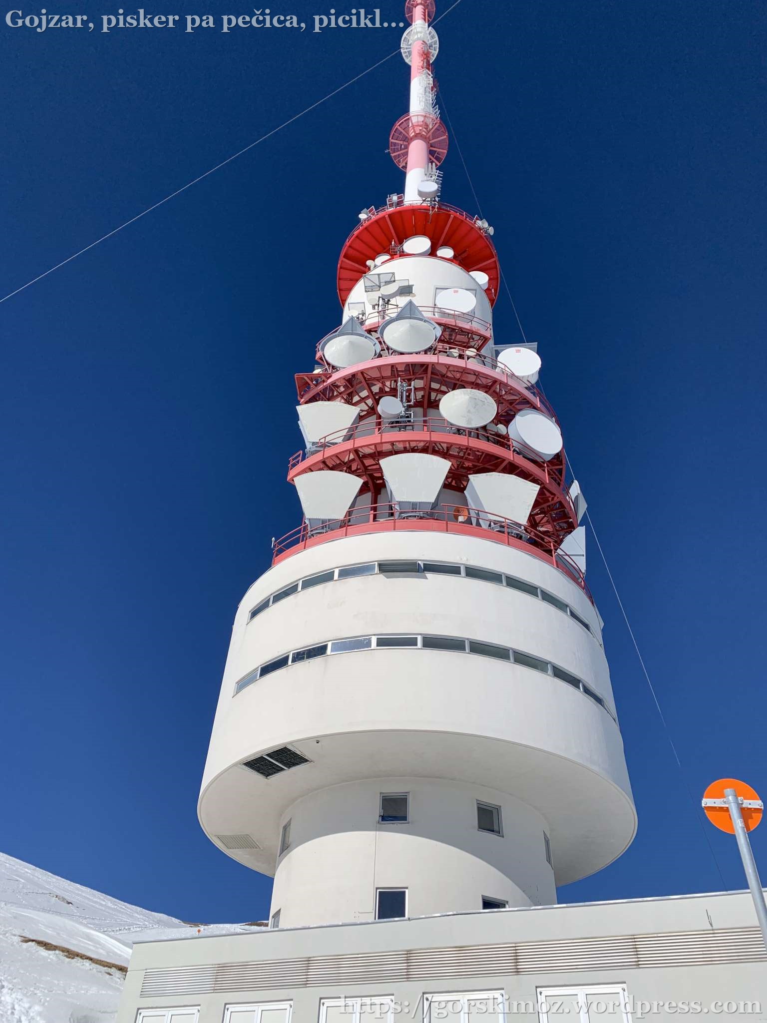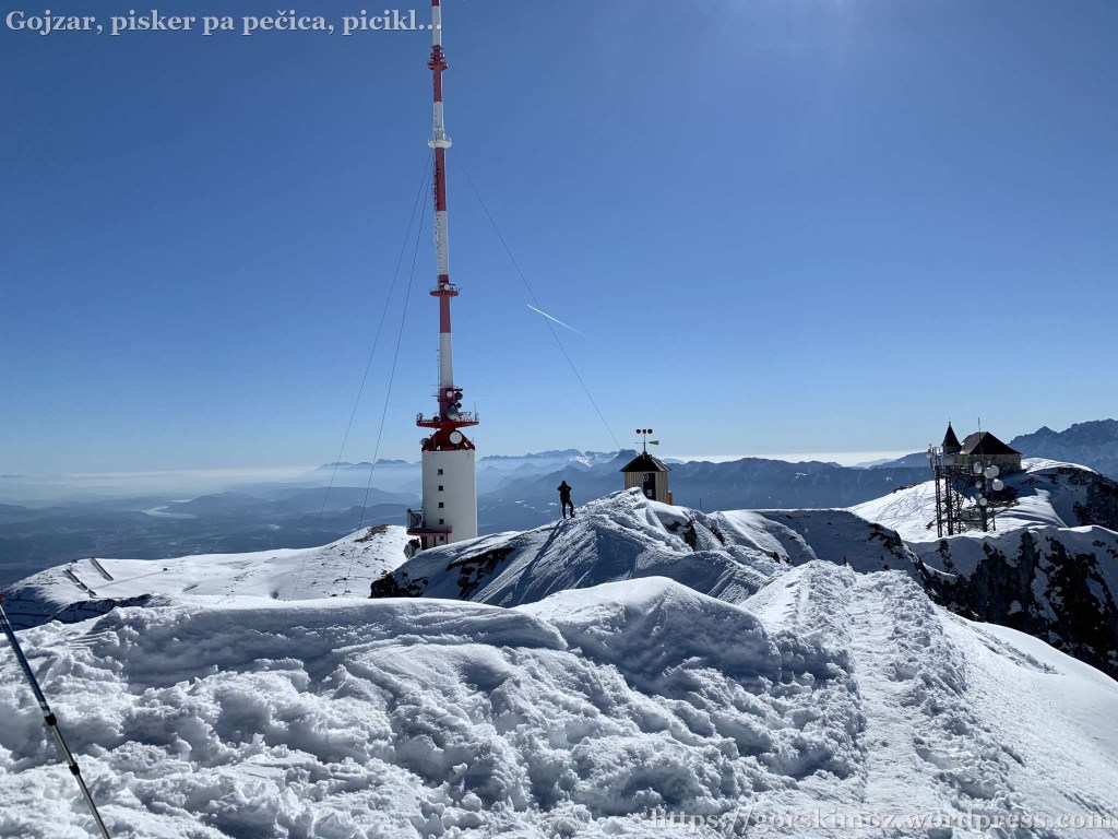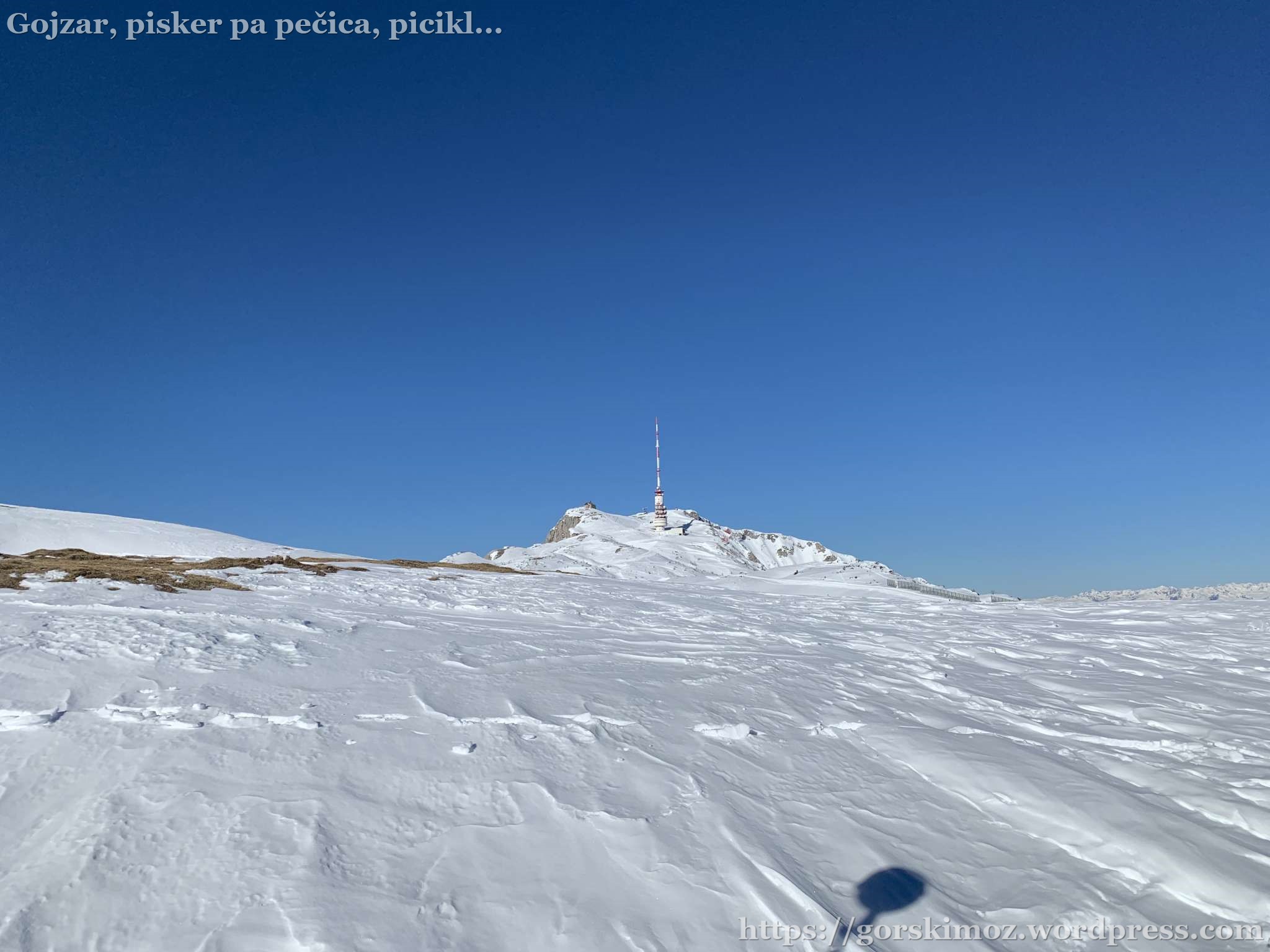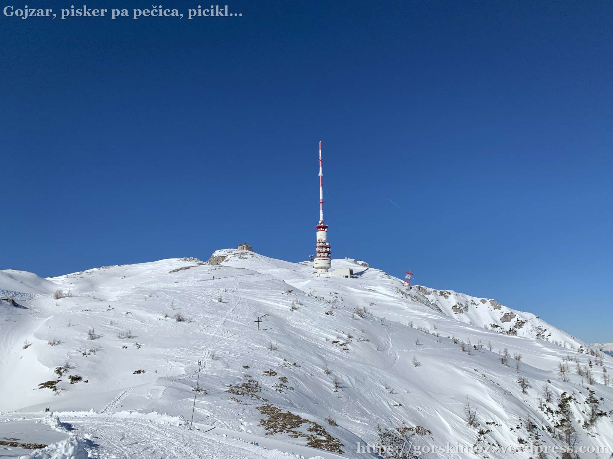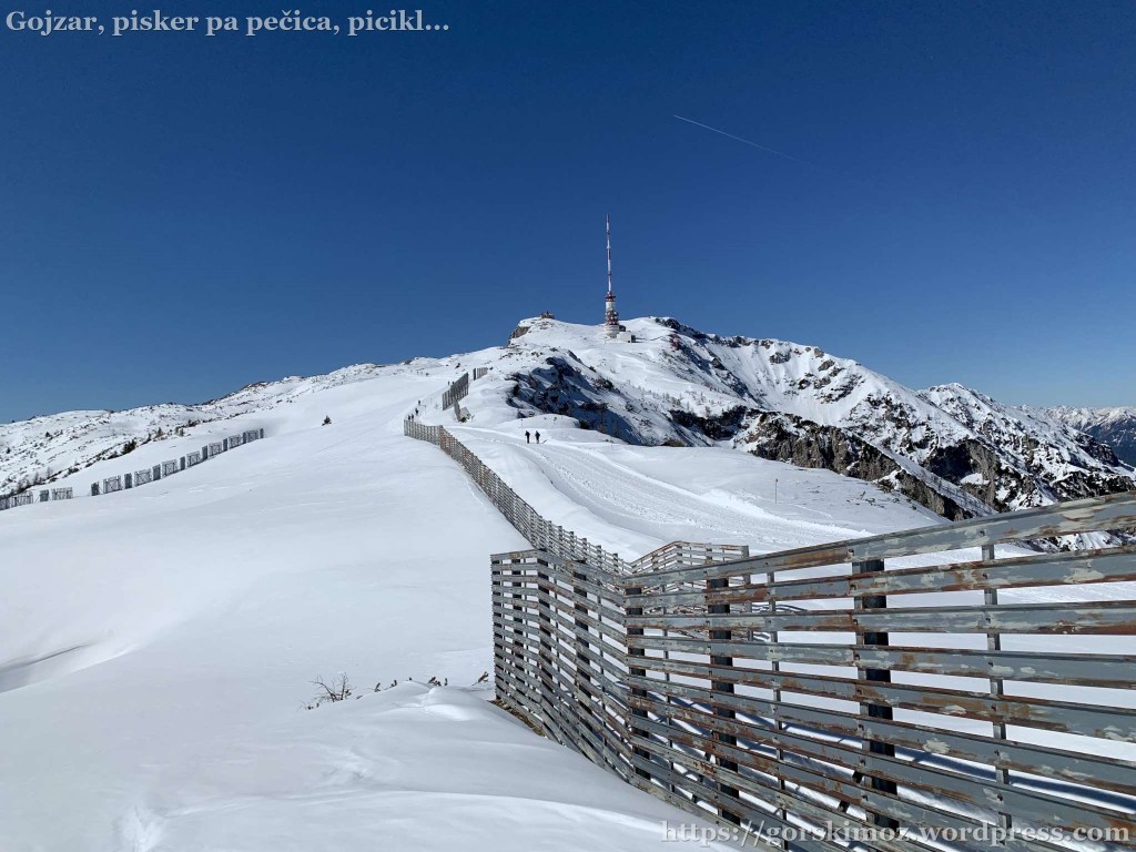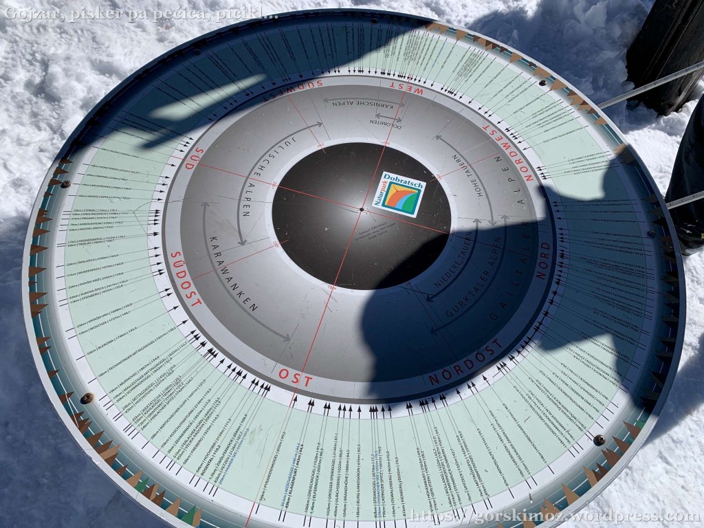 Že prekrasen razgled s parkirišča nas je navdušil, …… zato smo se hitro pripravili za pohod in se mimo koče na parkirišču…… odpravili na pot proti vrhu Dobrača.Prekrasna zimska idila……in čudoviti razgledi so nas spremljali…… po lepo označeni poti. Široka in lepo urejena pot je primerna za pohodnike, turne smučarje, sankače in vse druge obiskovalce.Razgledi so segali vse do nam tako ljube Pece na vzhodu.Kmalu smo se dvignili dovolj visoko, da smo zagledali mogočen stolp oddajnika pod vrhom.Igra sonca in senc ob poti.V prekrasni zimski idili smo uživali in se počasi bližali……vrhu. Stolp je postajal vse večji.Pogled nazaj.Kar naenkrat smo bili pod mogočnim stolpom.Pogled na prehojeno pot.Od stolpa je do koče le nekaj minut hoje.Pogled na cerkev, ki so jo postavili rudarji in delavci konec 17. stoletja.Do vrha nas loči še ozek in izpostavljen greben.Pogled z vrha proti stolpu, prej omenjeni cerkvi, ……in proti slovenski cerkvi tik pod vrhom in po dolini Zilje pod nami.Vetrnica na vrhu je lepo narejena in zelo natančna. Razgledi z vrhu so bili res fantastični.Pogled od cerkve proti Julijcem s Špikom, Oltarji, Škrlatico, Triglavom, Razorjem in Prisojnikom.Koča na gori je lepo in moderno urejena in le malo je ostalo od prve koče, ki je bila zgrajena v začetku 19. stoletja.Še en pogled na cerkev od spodaj……preden se odpravimo v dolino. Vodnik se nam je odpeljal na smučkah, …… mi pa smo se počasi vračali proti izhodišču.Krasna zimska idila……in lepi razgledi so nas spremljali tudi na poti nazaj.Nikamor se nam ni mudilo, saj je bila hoja pravi užitek.Že tako dobro urejeno pot so z ratrakom potegnili na novo in nam še olajšali hojo proti parkirišču.Utrinek s poti.Pogled na Julijce od Špika do Mangarta. V krasnem vremenu smo (pre)kmalu prišli……do koče in…parkirišča, ki se je od jutra dodobra napolnilo.