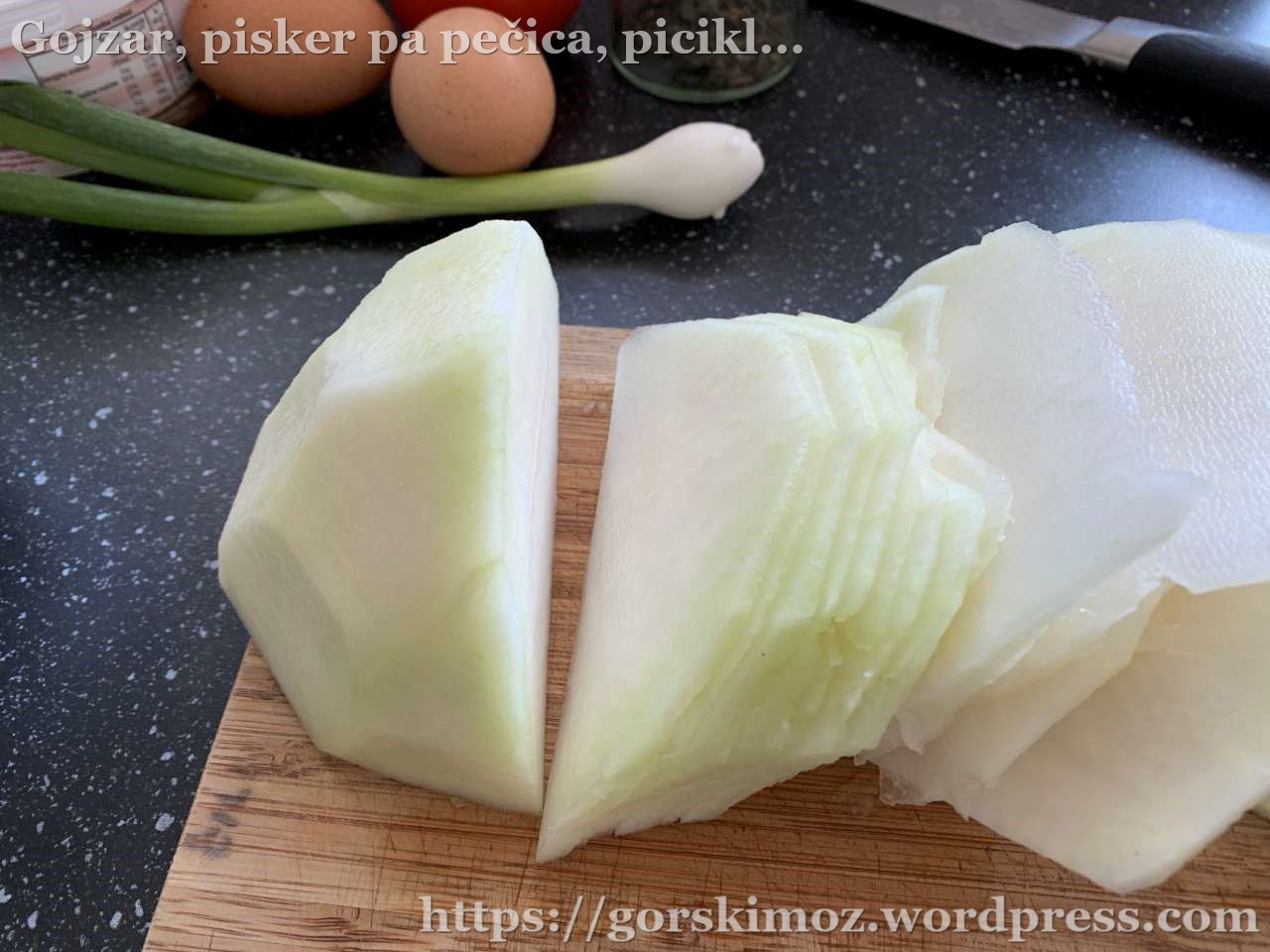 Kolerabo olupimo in narežemo na tanke rezine. Jaz sem uporabil surovo, zato da je ostala hrustljava. Če želite mehkejšo kolerabo, jo prej zblanširajte.