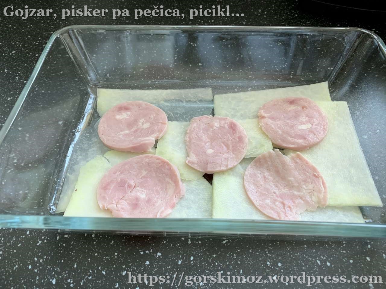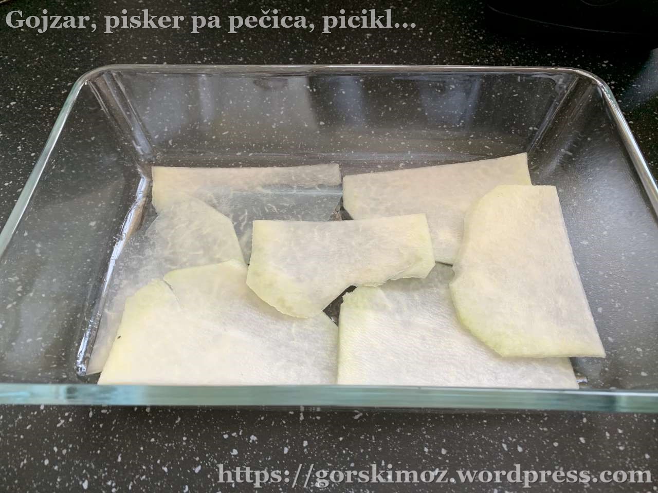 Pekač malo namastimo in vanj položimo prvo plast rezin kolerabe.