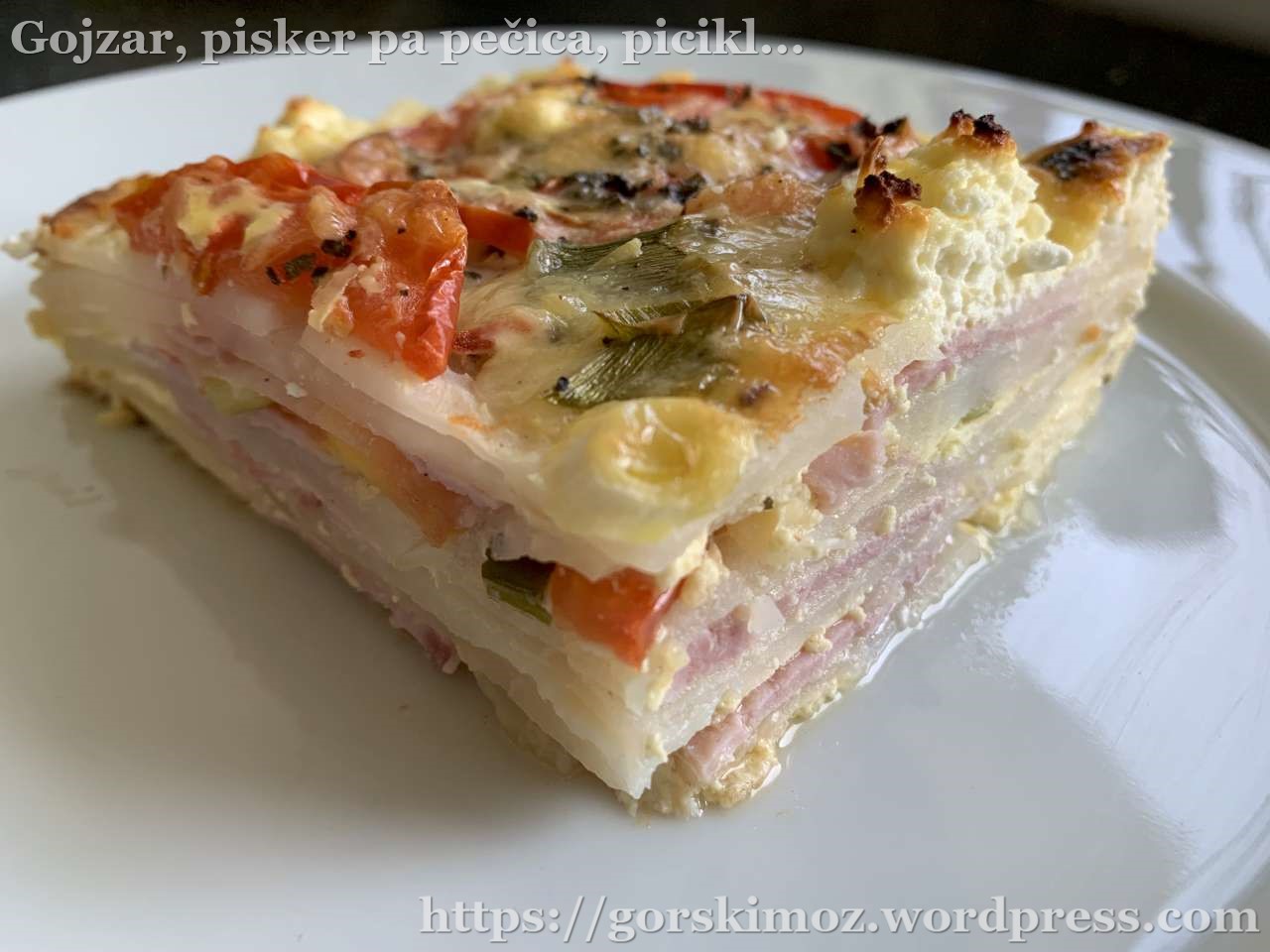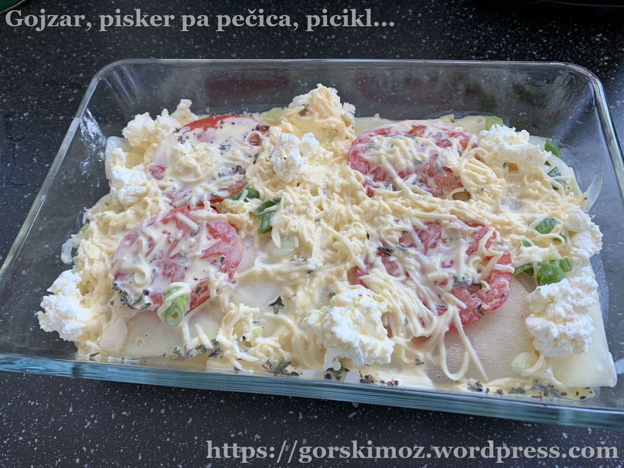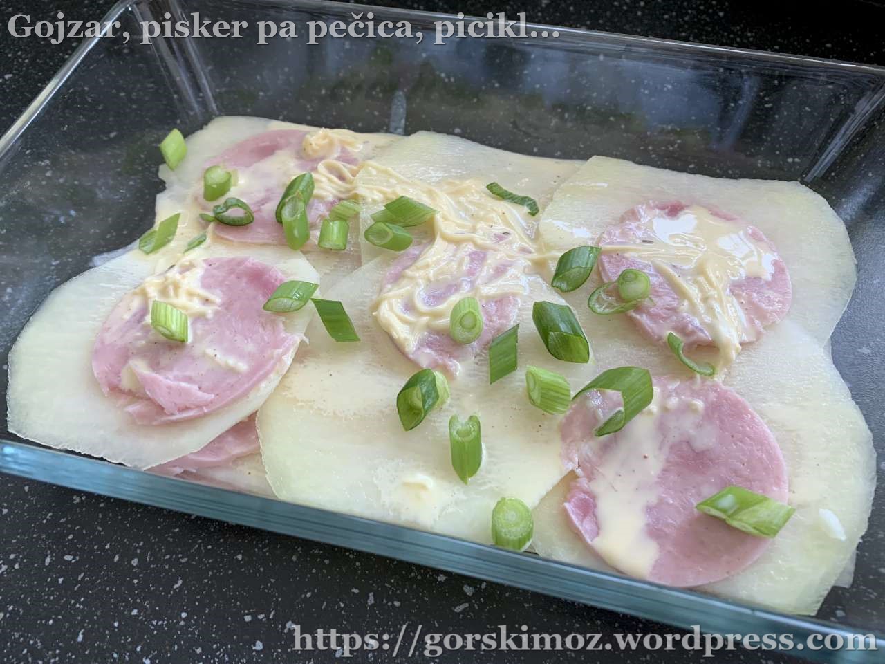 Na vsako drugo (ali tretjo) plast dodamo mlado čebulo in na rezine narezan paradižnik.