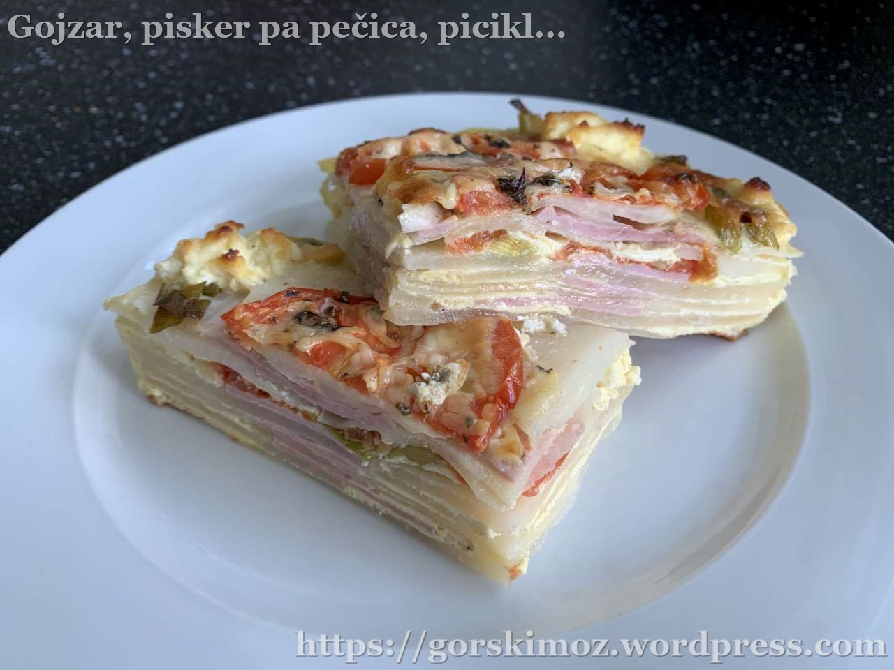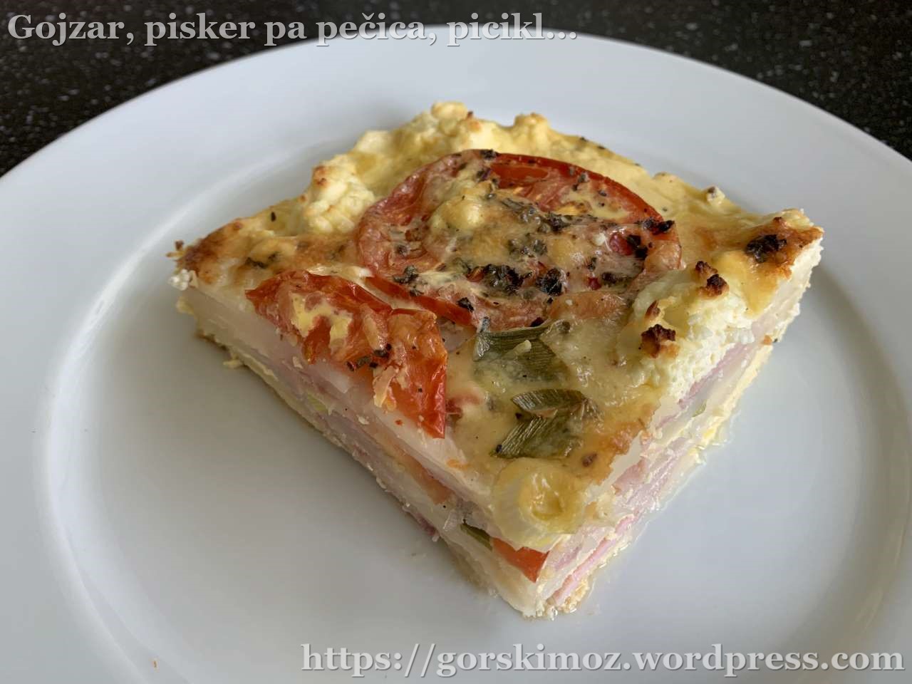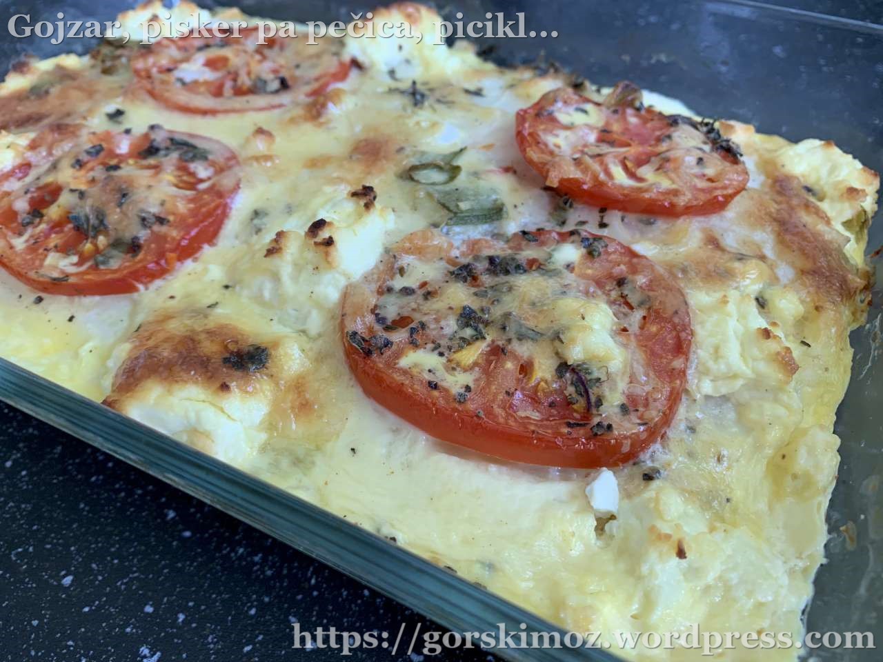 Na vsako drugo (ali tretjo) plast dodamo mlado čebulo in na rezine narezan paradižnik.
