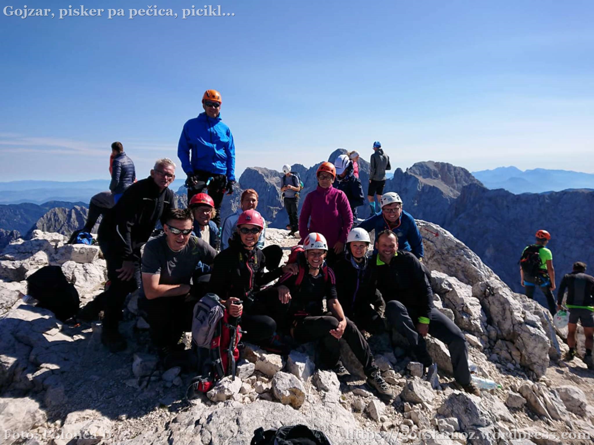 Še v mraku smo se zbrali pri Tičarjevem domu na Vršiču.Od koče smo po cesti krenili…… proti mogočnemu Prisojniku.Sprva je bila pot lahka, …… kmalu pa smo prišli do prvih jeklenic.Mojstrovke je medtem že obsijalo sonce.Hitro smo prišli do začetka plezalne poti in potrebno si je bilo nadeti čelado, plezalni pas in samovarovalni komplet.Za začetek smo obšli večjo skalo…… in prišli do prvega navpičnega dela poti.Sledil je lažji del poti skuzi ruševje…… s krasnimi pogledi na Ajdovsko deklico.Po dobro…… zavarovani …… in opremljeni poti…… smo se dvigali vse višje.Poglej nazaj.Malo višje smo že videli najtežji del poti, …… a treba je bilo še malo poplezati.Po ozki polici smo se približali najtežjemu delu poti.Pogled nazaj.V kaminu nad nami je bila gneča, zato smo na varni razdalji malo počakali.Ko je bila pot prosta smo se odpravili navpično navzgor po skobah.Pogled od spodaj …… in od zgoraj.Pogled na ožji del poti.Pogled navzgor.Pogled navzdol.Izhod iz kamina.Sledil je še lažji izhod iz…… iz najtežjega dela poti.Sledil je lažji del poti brez varoval.Malo še, pa bomo pri oknu.Preplezati smo morali še nekaj težjih delov…… in hitro smo pred nami…… zagledali Prednje Prisojnikovo okno.Tik pod Oknom je pot polna grušča. zato je potrebno biti še posebej previden.Pot skozi Okno je speljana naravnost navzgor.Pogled navzgor.Pogled navzdol.Izstop skozi Okno.Pogled skozi Okno.Od Okna smo se usmerili na grebensko pot.Malo smo si odpočili in se okrepčali z zelo dobrim pecivom, ki ga je prinesla ena od planink.Po krajšem počitku smo se…… ob lepih razgledih odpravili……proti grebenu.Na nekaj mestih je bila pot varovana z jeklenicami.Hodili smo tik pod ali …… po grebenu.Pogled na Razor, Pihavec in Triglav.Pogled proti Vršiču pod nami.Pogled proti Jalovcu in Mangartu. Spredaj desno Mojstrovke, v ozadju Montaž.Pot po grebenu je lepo speljana in……in vrh Prisojnika je bil vse bližje.Nekajkrat smo se spustili……in spet vzpeli.Sledil je še zadnji vzpon proti vrhu.Razpotje malo pod vrhom.Vrh Prisojnika.Na vrhu je bilo kar nekaj planincev.Trio “Bavških slavčkov” na vrhu.Skupinska slika z vrha.Panorama od vzhoda do zahoda, od Škrlatice do Mangarta.Pogled proti Triglavu.Špik, Škrlatica in Dolkova špica.Bavški Grintavec, Pelci, Jalovec in Mangart.Pred odhodom z vrha vodniki naredimo še eno sliko, …… nato pa se odpravimo po Slovenski poti…… proti Vršiču.Pogled nazaj proti vrhu.Pot poteka po krušljivem in gruščnatem terenu, zato je potrebno paziti pri vsakem koraku.Mogočna stena Prisojnika.Tudi na poti navzdol smo morali premagati nekaj skalnih skokov.Del poti skozi široko grapo.Pot je lepo varovana.Pogled nazaj.Kmalu je pot postala lažja in prav so nam prišle pohodne palice.Pogled na travnata pobočja, ki smo jih prečili na poti navzdol.Planike ob poti.RazorRazpotje poti proti Zadnjemu Prisojnikovemu oknu.Mi smo nadaljevali proti Vršiču.Pogled nazaj.V krasnem vremenu je pot navzdol minila zelo hitro…… in Vršič je bil vse bližje.Pogled proti Vršiču.Prečiti smo morali še krajše melišče.Še zadnji pogled na Jalovec.Malo nad Vršičem.