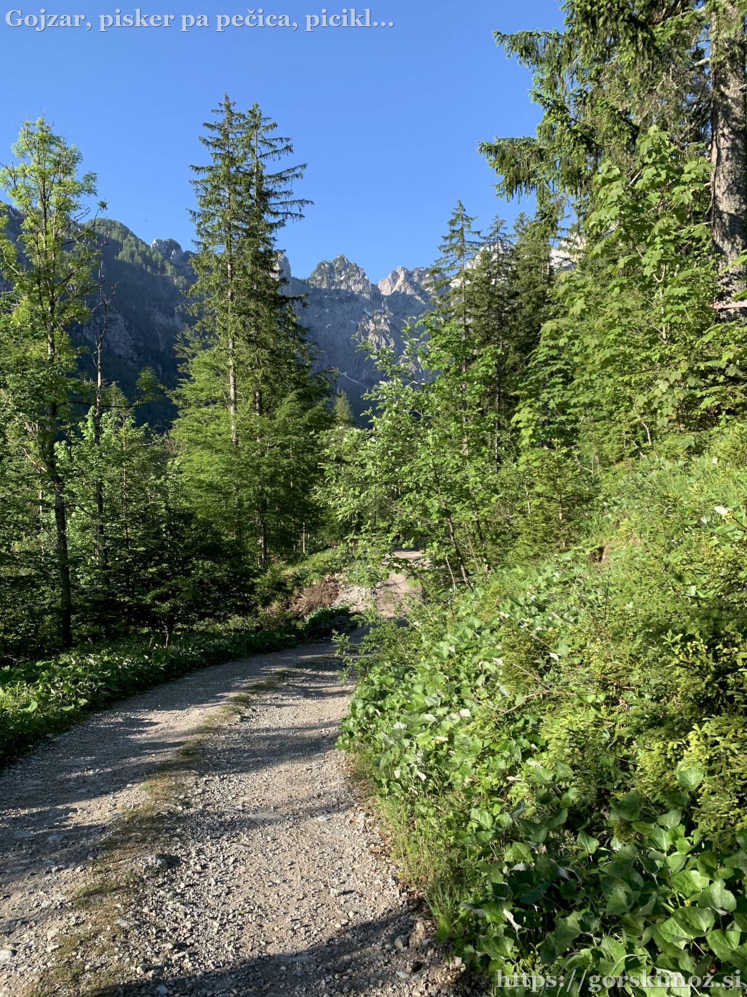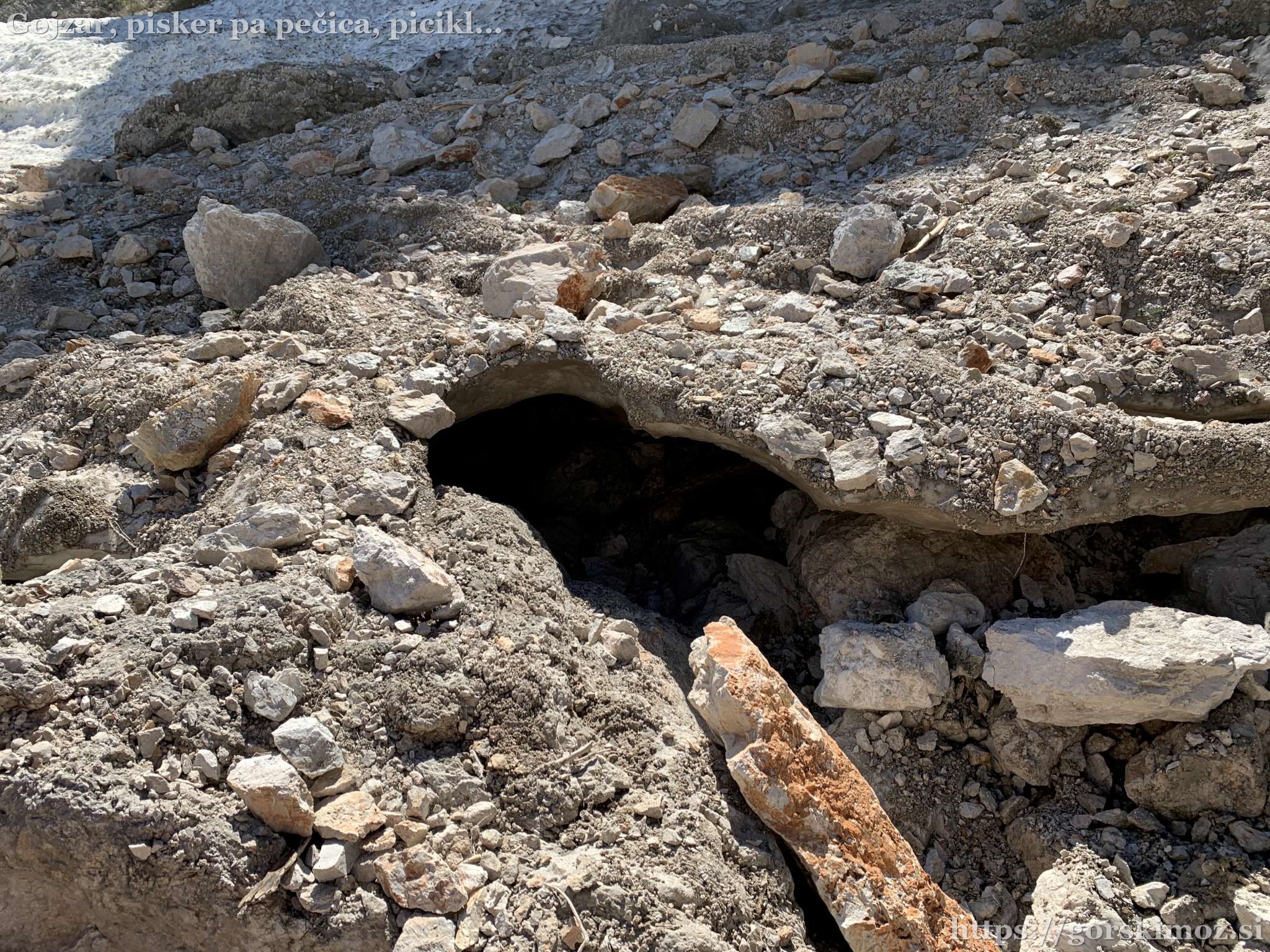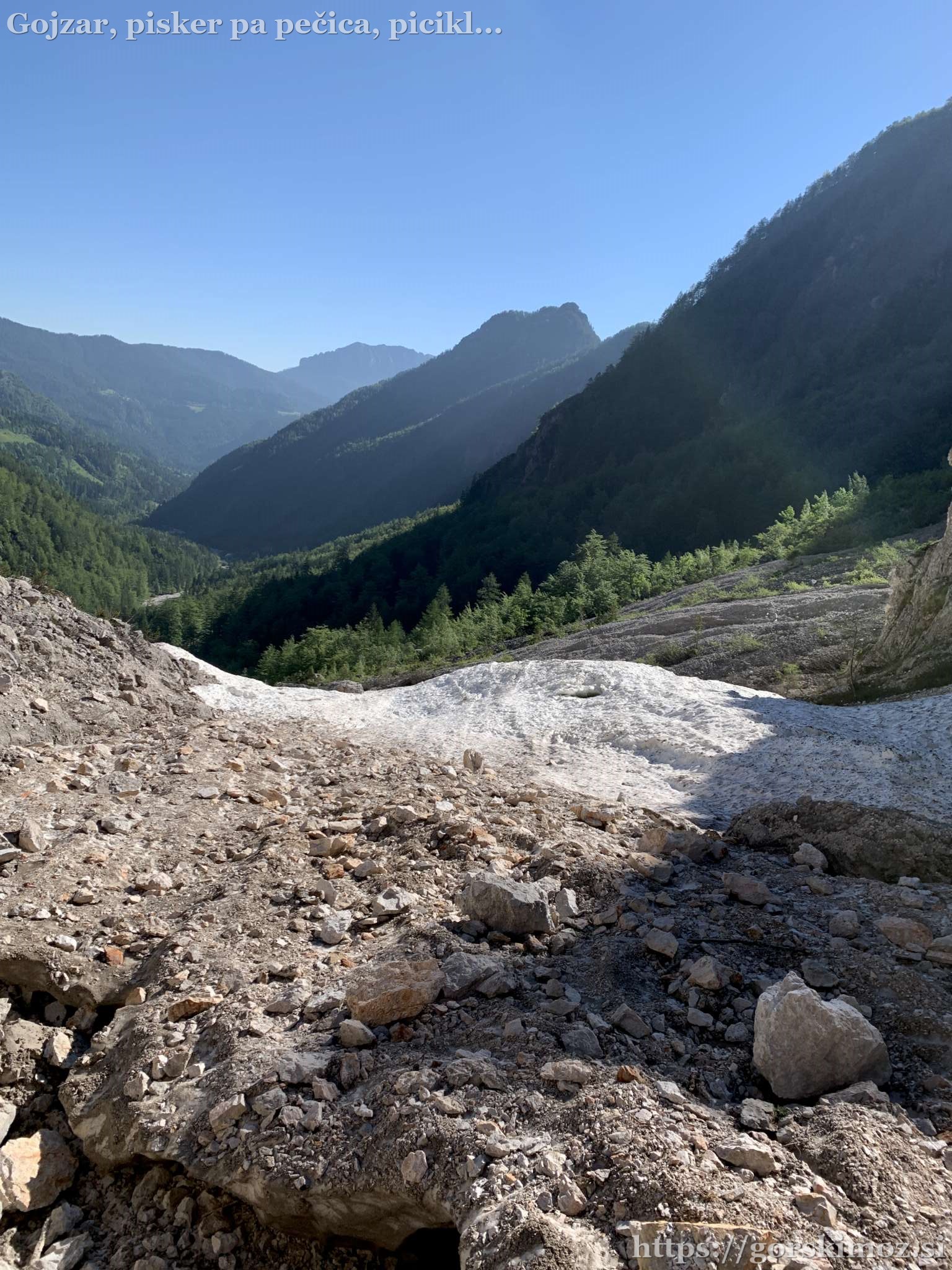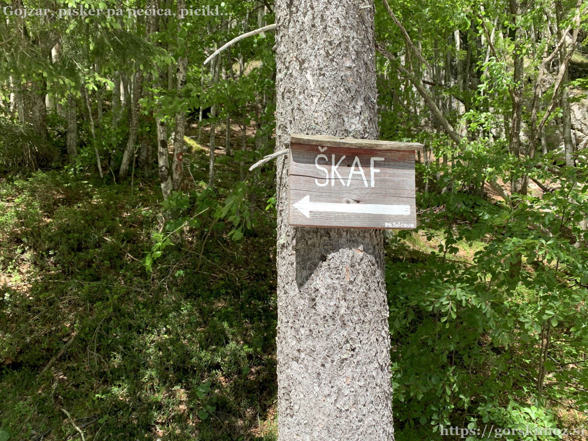Avto sva parkirala na prvem desnem ovinku nad elektrarno ….… in se po cesti odpravila proti dolini.Kmalu sva prišla do …… suhe struge potoka Jezera.Odpravila sva se kar po strugi navzgor. Pot je označena z možici.Pogled nazaj.Kmalu sva prišla do snega.Po snegu sva nadaljevala pot proti škafu.Luknja pod snegom, na vrhu pa ogromno drobirja…Pogled nazaj.Vzpon po senci je bil prijeten, Sneg je bil pomrznjen in potrebna je bila zimska oprema.Še malo pa bova pri škafu.Tik pred škafom.Pogled v škaf. Dan pred najinim “obiskom” je bil globok (ali visok) 16m.Pogled na škaf je res nekaj posebnega in kar ne naveličaš se občudovanja te naravne znamenitosti.Naslednjič vzamem opremo in vrv in se spustim do dna…Vpisna skrinjica in kažipot za Mrzlo goro pri škafu.Pogled proti dolini od škafa. V ozadju Olševa.Sestopala sva previdno, saj je na pomrznjenem snegu vse polno kamenja.Pogled nazaj proti škafu,Macesen se je spustil v dolino.Sestop je bil mogoč tudi po “toboganu”.Še malo pa bova na koncu snežišča.Pogled nazaj proti škafu.Pot v dolino sva nadaljevala po potki…Pogled proti snežišču pod nama.Pot poteka najprej po odprtem terenu…… kmalu pa prideva v gozd.Pri prečenju snežišča občudujeva naravni most iz snega. Debelina mostu je cca 2m, dolina pa je vsaj 8m pod nama. Ogromno snega…Luknja v snegu ob od sonca razgreti skali.Pogled na snežišče in slap nad njim.Prečila sva še nekaj potočkov.Pogled nazaj proti škafu.Oznaka za škaf ob poti.Suha struga.Pogled proti škafu.Oznaka za škaf je slabo vidna, ker jo zakrivajo veje.Pot preči strugo … … in se nadaljuje po cesti.
