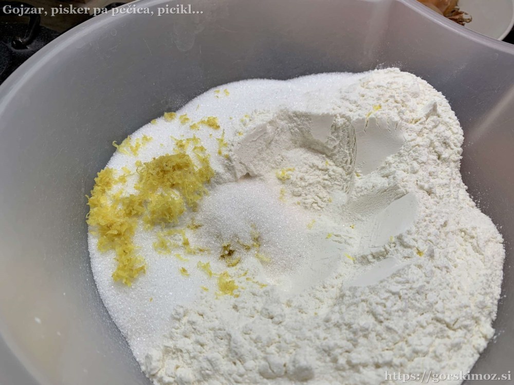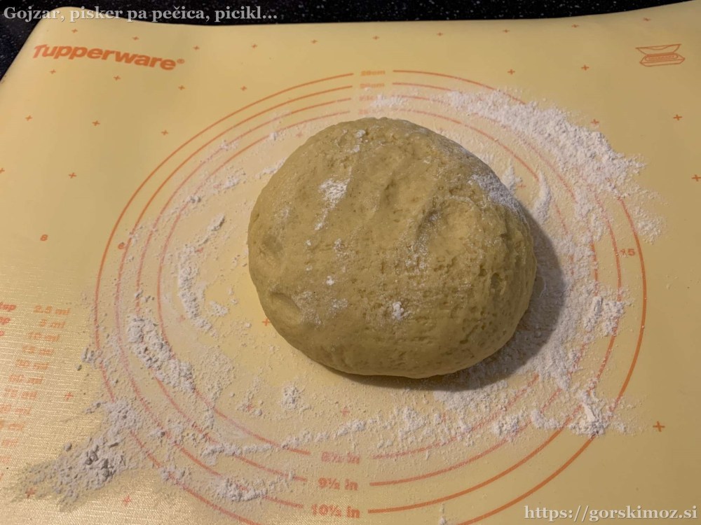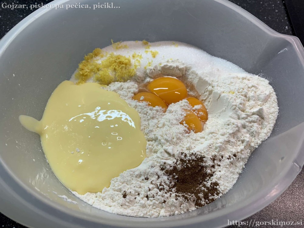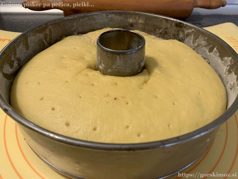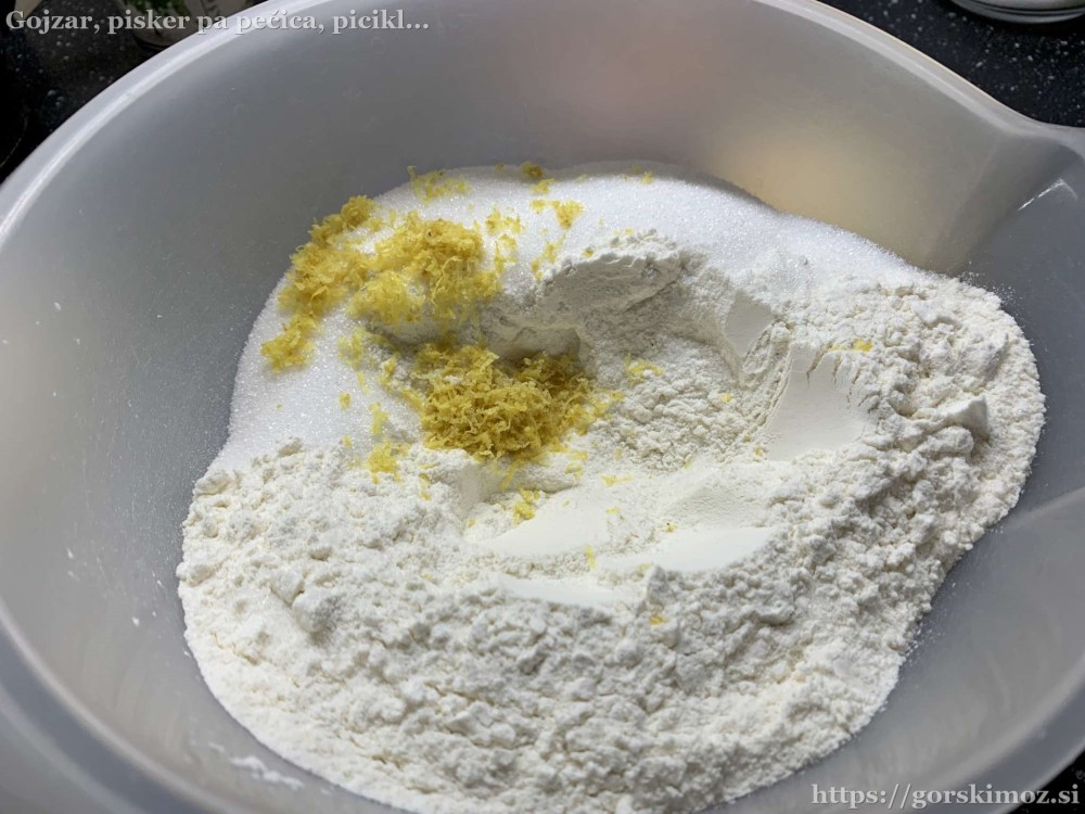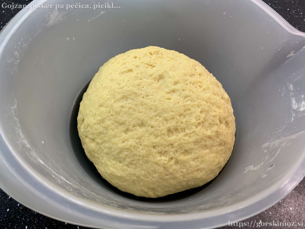 Najprej pripravimo kvasec. Malo segrejemo mleko, vanj nadrobimo kvas in dodamo nekaj sladkorja in moke.V drugo posodo damo moko in sladkor, …… dodamo limonino lupinico in ščep soli …… ter vanilijev sladkor.Dodamo rumenjake …… in zmehčano maslo ter muškatni orešček.Na koncu dodamo še kvasec …… in zamesimo testo.