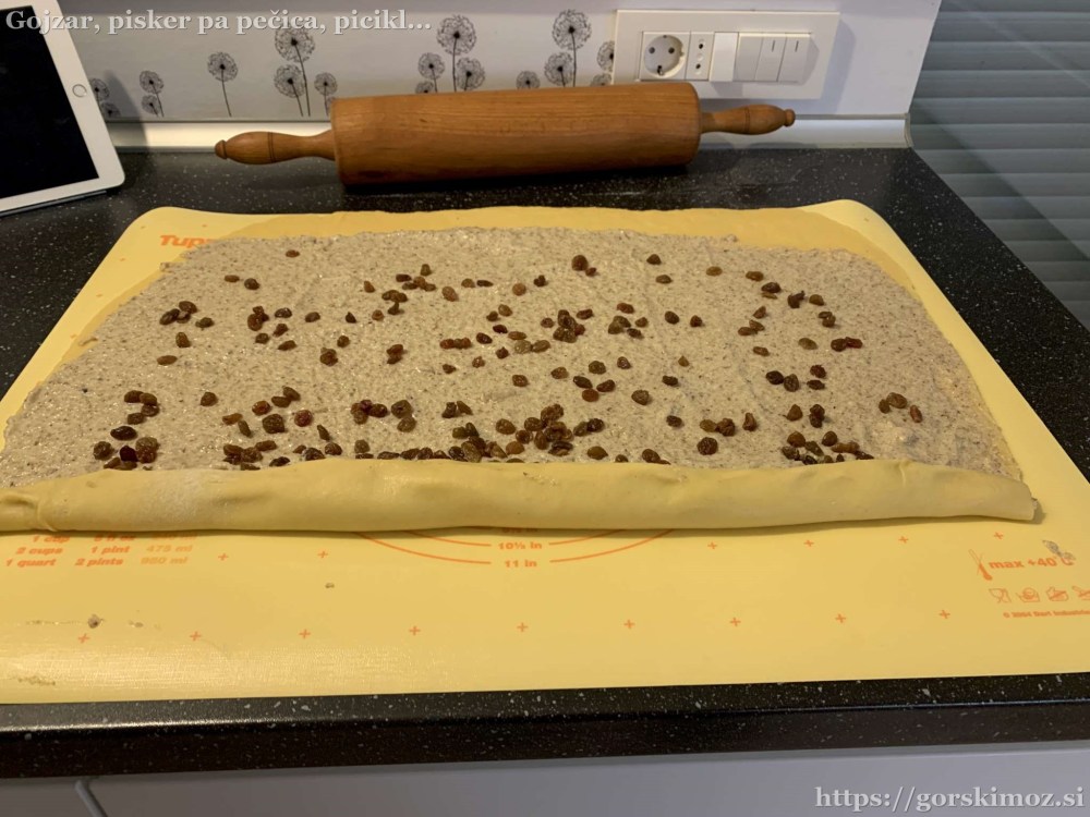 Testo damo na pomokano površino in ….. ga razvaljamo na cca 3-4 mm debelo.Razvaljano testo enakomerno premažemo z nadevom, …… ter posujemo z rozinami.Potico zvijemo.Model namastimo z maslom in posujemo z moko.Zvito potico …… po potrebi skrajšamo in …… previdno prestavimo v model. Malo poravnamo in preluknjamo s palčko za ražnjiče ter damo vzhajat čez noč.Zjutraj najprej segrejemo pečico na 180°C. V segreto pečico damo vzhajano potico. Pečemo 1h do 1h in pol – odvisno od modela. Pečeno potico pustimo še nekaj časa v pekaču, …… nato pa jo vzamemo iz modela in počakamo, da se ohladi.Ohlajeno pečico potresemo s sladkorjem v prahu, …… narežemo …… in postrežemo. Pa dober tek!