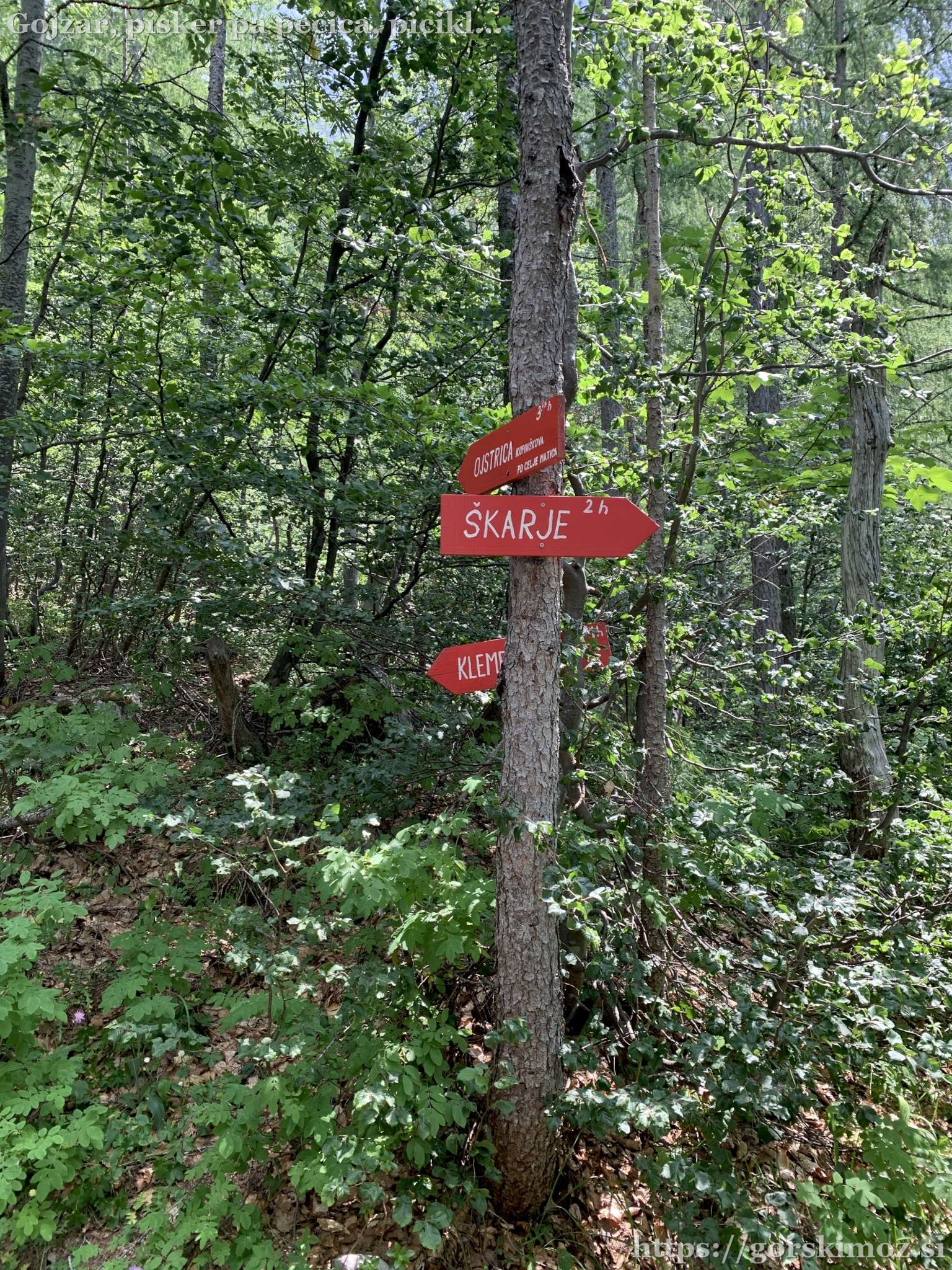 Začeli smo v Logarski dolini na parkirišču nasproti Doma planincev.Skozi gozd smo se začeli vzpenjati.Potoček ob poti je bil zaradi suše suh kot poper.Razpotje malo pod Klemenčo jamo.Ojstrica ožarjena z jutranjim soncem.Pri Koči na Klemenči jami smo si malo oddahnili …… nato pa nas je pogled na Ojstrico zvabil po poti naprej.Razgledi so bili vse lepši, …… pot pa vse bolj strma.Na razpotju za Kopinškovo pot in pot na Škarje smo zavili levo.V ključih smo se vzpenjali proti Škrbini.Ciklame ob poti.Gozd je bil vedno redkejši.Krofička nad nami.Pogled nazaj.Pogled na Krofičko s Škrbine, kjer so si malo odpočili in pomalicali.Pogled v Robanov kot.Pogled proti ostalim vrhovom Kamniško-savinjskih alp.Vrh Ojstrice nad nami.Pred začetkom plezalnega dela poti smo se opremili.Začetek plezalnega dela.Vzpenjali smo se hitro…… in uživali v razgledih.Pogled na pot, …… ki je lepo zavarovana.Lestev na nekoliko zahtevnejšem delu.Napredovali smo hitro.Zoisove zvončice ob poti.Del poti zavarovan s klini.Malo še …… pa smo prišli na izpostavljen greben.Pogled nazaj.Pogled na zahtevnejši del poti.Vzpon po skobah.Pogled nazaj.To še preplezamo…… in pridemo do melišča pod vrhom Ojstrice.Pogled nazaj.Še nekaj jeklenic …… in ob krasnih razgledih bomo prišli na vrh.Vzpon po gladki skali tik pod vrhom.Pogled nazaj.Zadnji vzpon …… pred vrhom Ojstrice.Razgled na planino Korošica pod nami. v ozadju Velika planina.Razgledi z vrha so bili prekrasni.Po krajšem počitku in okrepčilu smo se podali na pot proti Škarjam.Pogled nazaj proti vrhu.Sestop po gruščnatem terenu smo opravili pazljivo.Pogled nazaj.Še malo …… in prišli smo do razpotja za Škarje. Zavijemo desno.Uživamo v razgledih.Sledi prečenje po ozki polici, ki je komaj kaj zavarovana.Jeklenica na koncu zahtevnega dela poti.Sledi prečenje melišča.Zdelane table ob poti.Pogled nazaj.Od razpotja sledi krajši vzpon proti Škarjam.Pogled na Lučko babo in Planjavo v ozadju.S Škarij sestopimo proti Logarski dolini.Pogled na melišče pod nami in na krasno kuliso Grintovcev pred nami.Pogled proti Logarski dolini z Olševo in Peco v ozadju.Pogled nazaj proti vrhu Ojstrice.Rjavčki vrh pod nami.Pogled na Skuto, Rinke in Mrzlo goro.Rjavčki vrh.Pogled na pot skozi Grlo, po kateri smo pred leti po plohi sestopali.Pogled proti Ojstrici.Kmalu smo skozi redek gozd …… prišli do melišč pod Ojstrico.Nekaj snega ob poti.Kmalu smo z melišč prešli v gozd …… in se vrnili na razpotje, kjer smo zjutraj zavili levo.Sledil je sestop do Koče na Klemenči jami.Na Koči smo si vzeli čas za daljši počitek in se nato odpravili …… nazaj proti …… Logarski dolini.