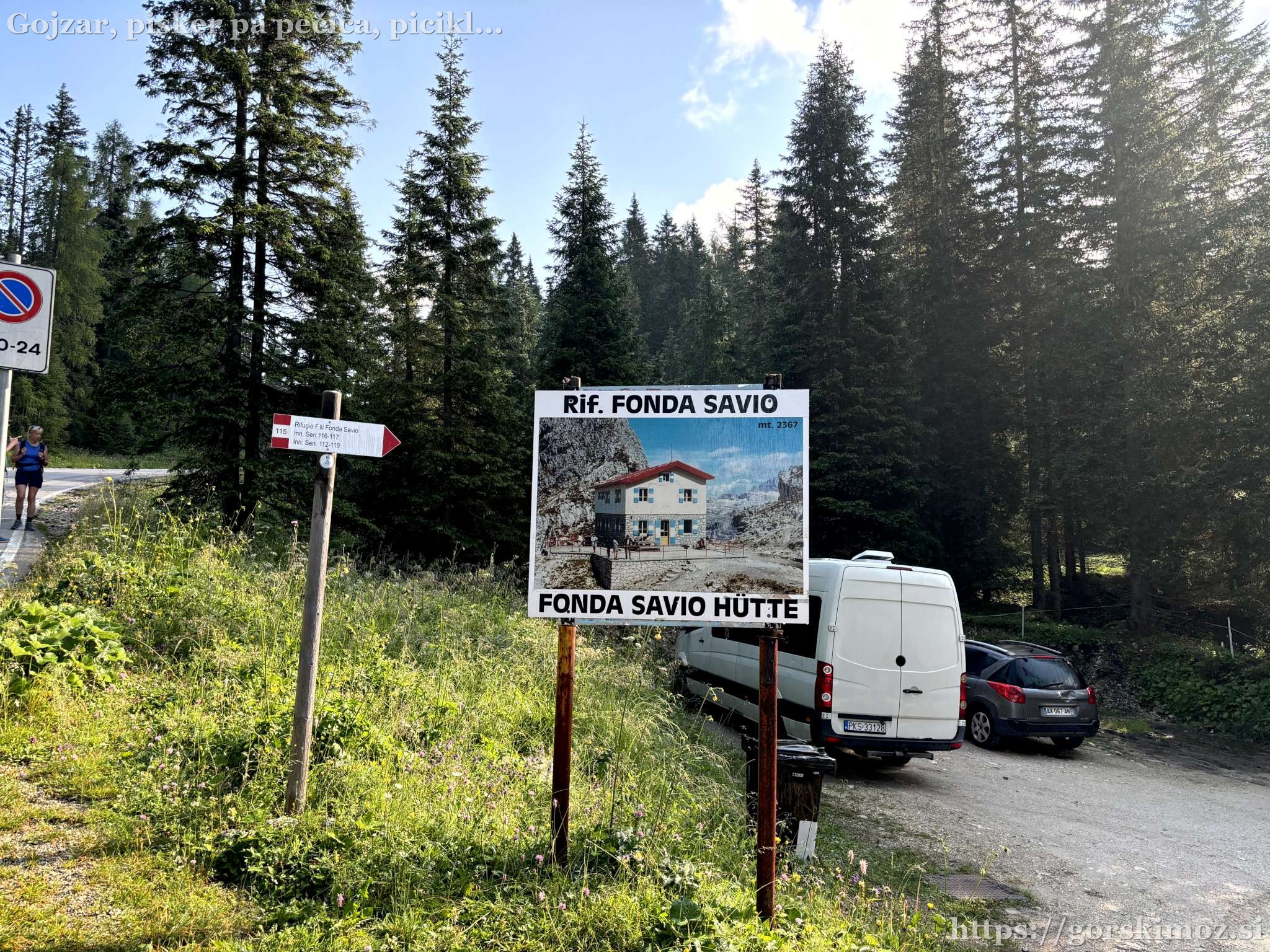 Pohod smo začeli na parkirišču, ki je na začetku ceste na Tri Cine.Pogled na vrhove s ceste.Odcep za kočo Fonda Savio.Pot sprva poteka po široki makadamski cesti.Kmalu pridemo do pašnika.Smerokazi ob poti. Mi gremo po poti 115.Pot se zoži in se zmerno vzpenja.Pogled nazaj.Pogled proti vrhovom nad potjo.Gozd je vse redkejši. Nadmorska višina je že čez 2000m.Pogled nazaj.Svizce smo slišali ampak jih nismo videli.Utrinek s poti.Pogled proti koči Fonda Savio. V ozadju v megli je naš cilj – Cima Cadin.Panorama proti dolini.Prečenje melišča.Pogled nazaj.Kažipoti malo pod kočo.Zadnji del poti proti koči je malo zahtevnejši.Pogled nazaj.Koča Fonda Savio.Pogačice pred kočo.