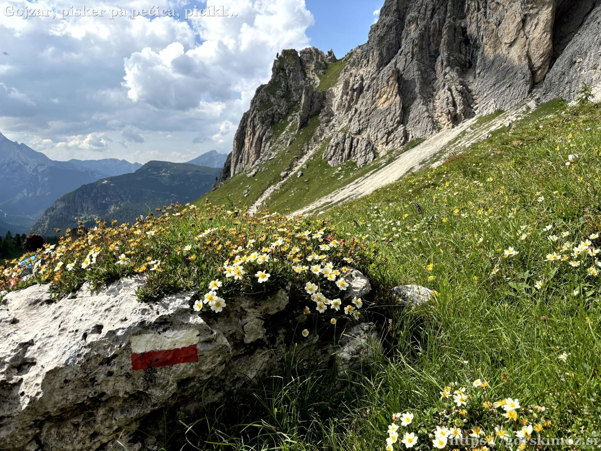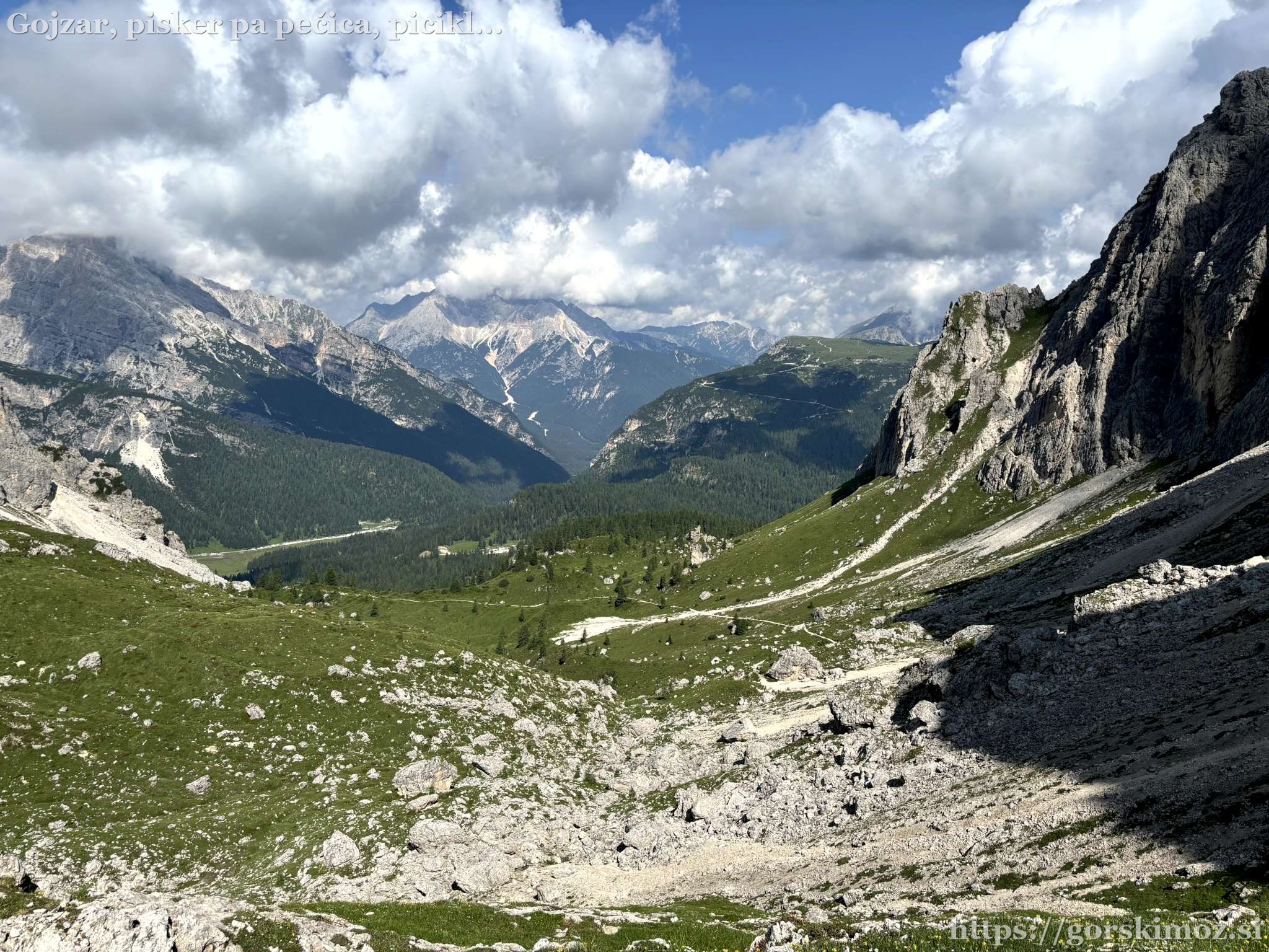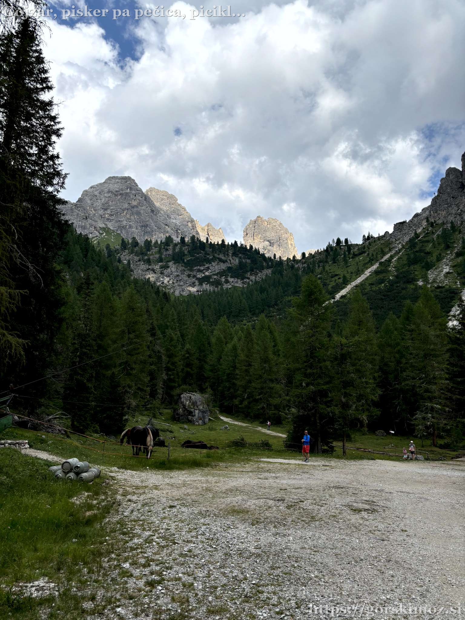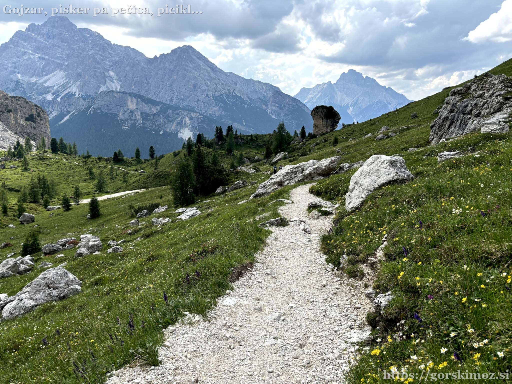 Kernerjev mak ob poti.Cvetje ob poti.Razgledi na s soncem obsijane gore ti vzamejo sapo in enostavno uživaš.Po poti se hitro spuščamo.Pogled nazaj proti koči in goram nad njo.Pogled proti dolini. V sredini Croda Rossa d’Ampezzo.Razgledi so bili prekrasni.Turška lilija ob poti.Skala ob poti proti pašnikom.Konji na paši. Prvič sem videl konje z zvonci.Košara za transport na koči Fonda Savio.Pogled nazaj na prehojeno pot.Pogled s ceste. Najvišji vrh je Punta Sorapiss.Pogled na Tri Cine z obale jezera Misurina.