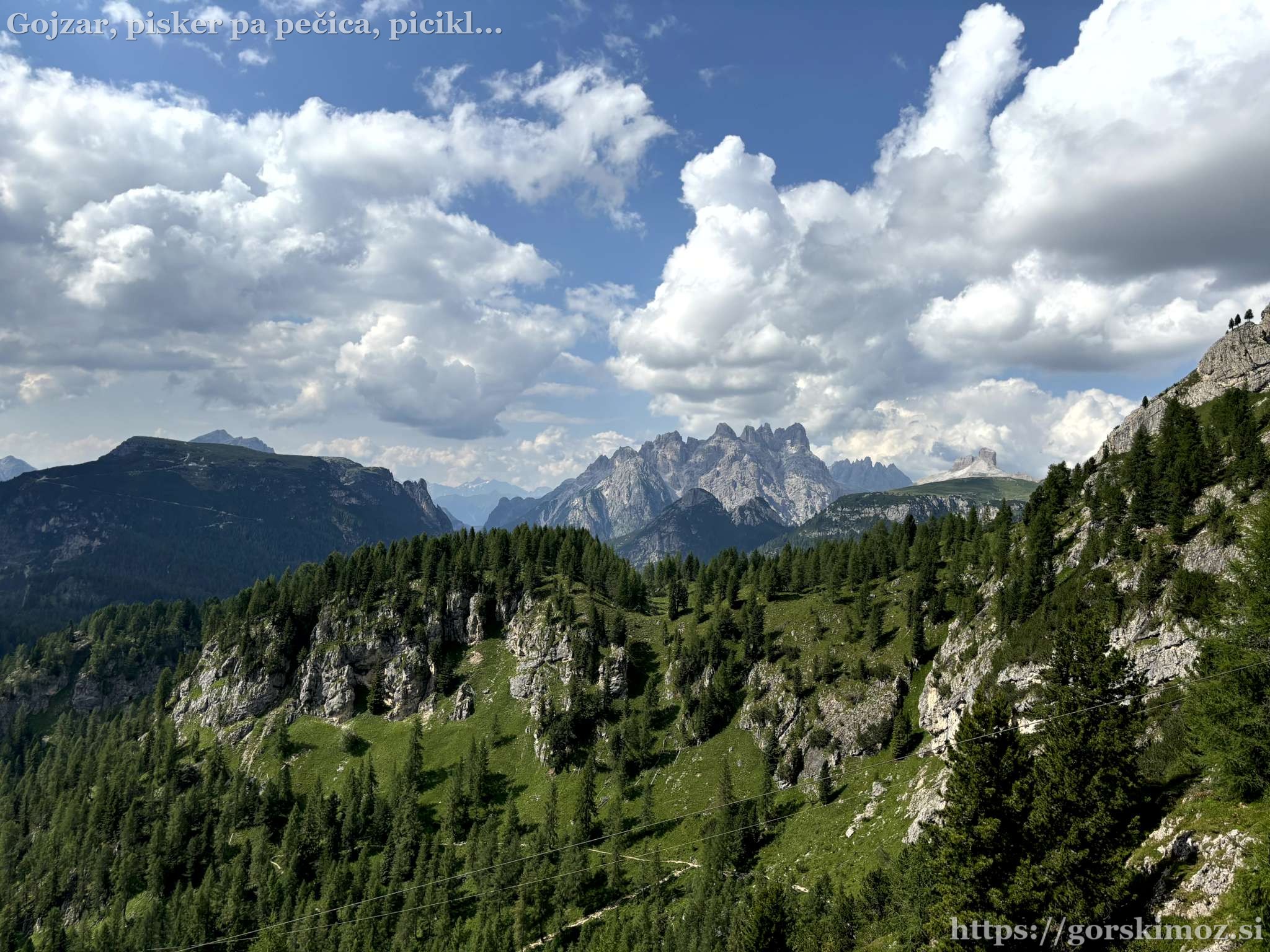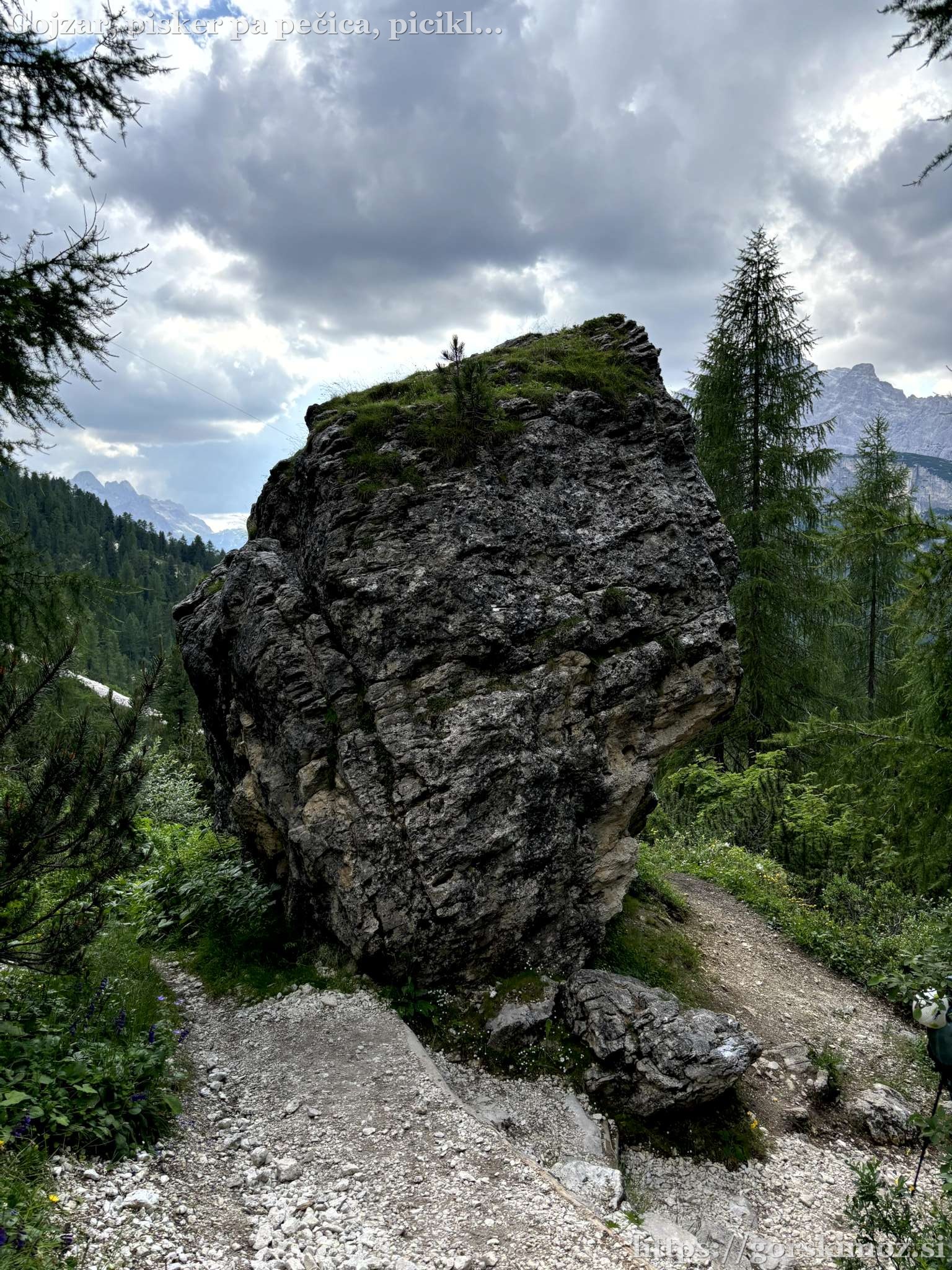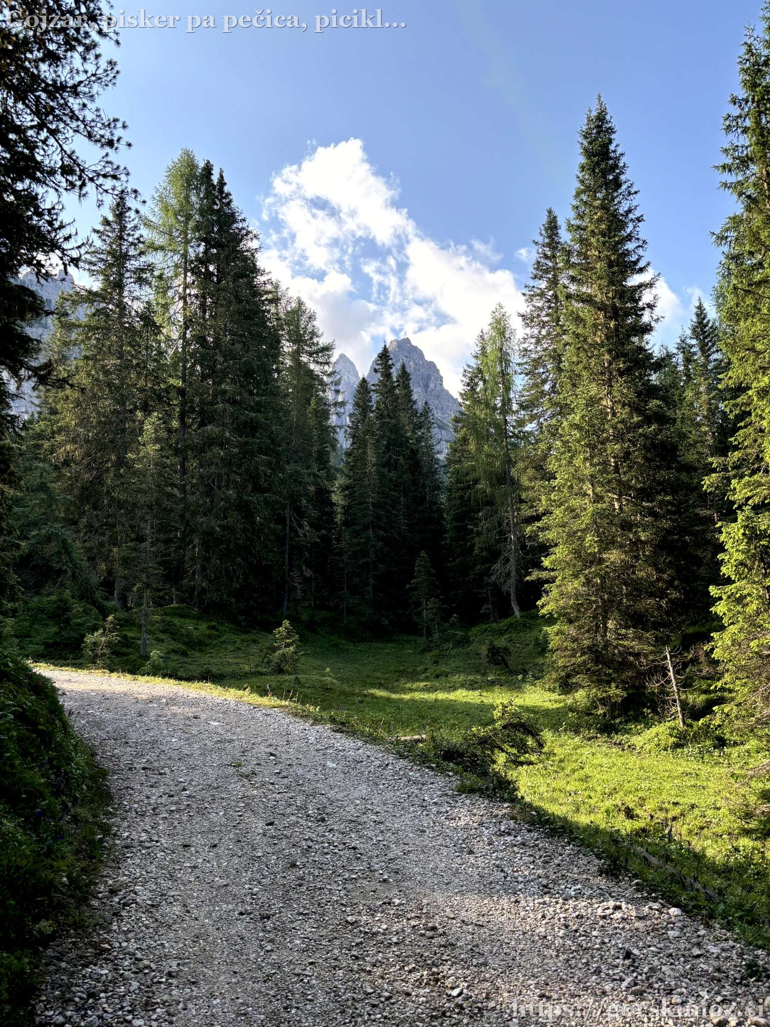 Kernerjev mak ob poti.Cvetje ob poti.Razgledi na s soncem obsijane gore ti vzamejo sapo in enostavno uživaš.Po poti se hitro spuščamo.Pogled nazaj proti koči in goram nad njo.Pogled proti dolini. V sredini Croda Rossa d’Ampezzo.Razgledi so bili prekrasni.Turška lilija ob poti.Skala ob poti proti pašnikom.Konji na paši. Prvič sem videl konje z zvonci.Košara za transport na koči Fonda Savio.Pogled nazaj na prehojeno pot.Pogled s ceste. Najvišji vrh je Punta Sorapiss.Pogled na Tri Cine z obale jezera Misurina.