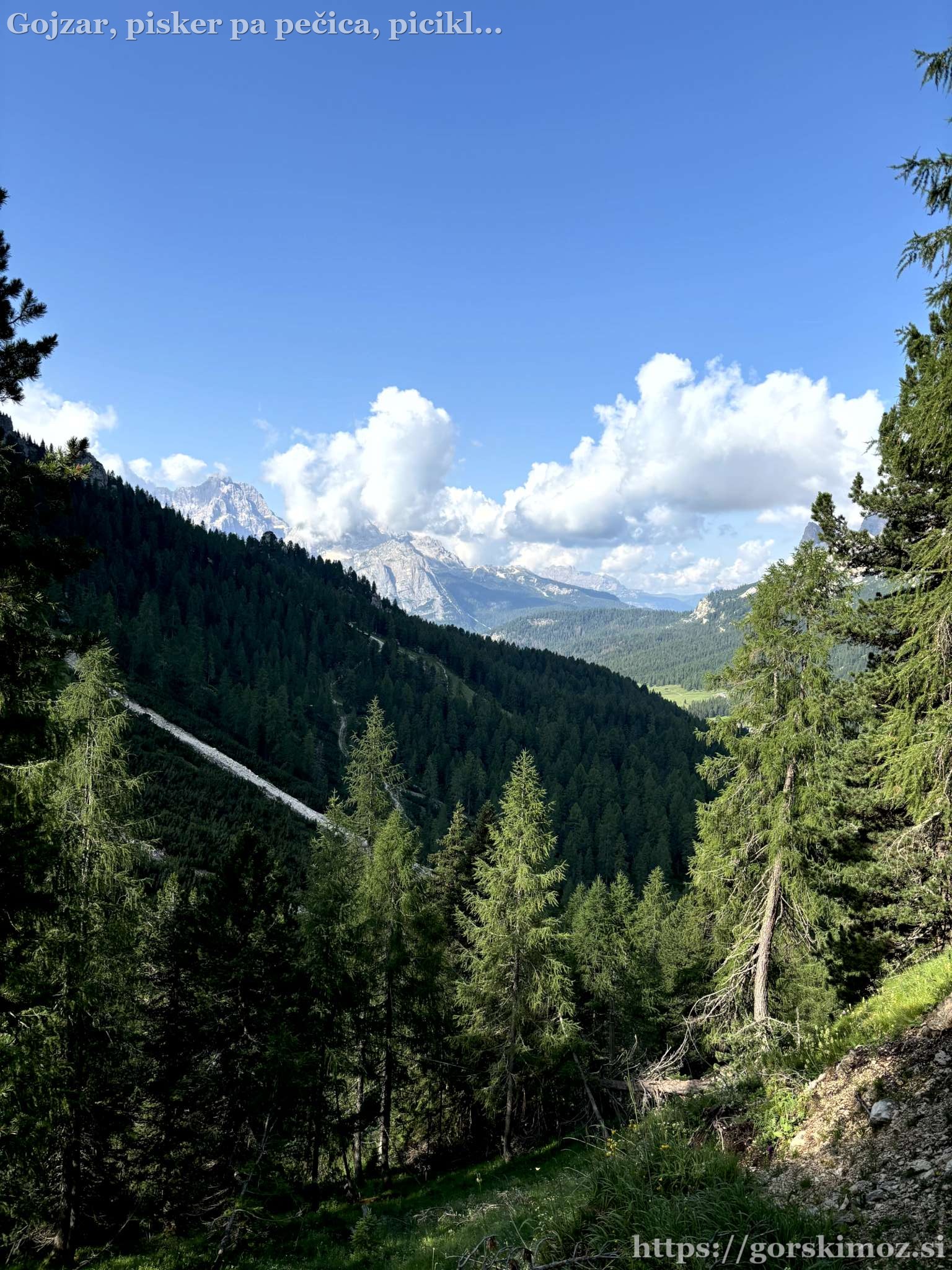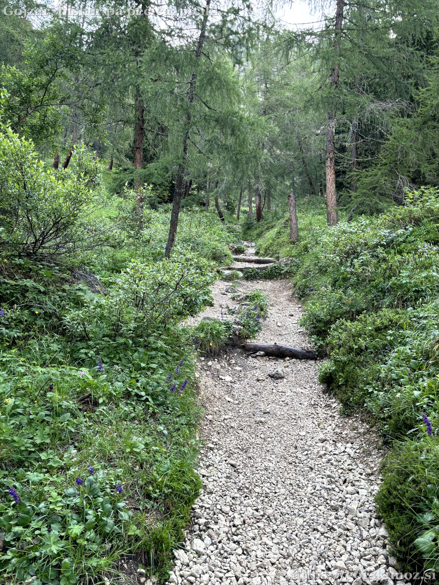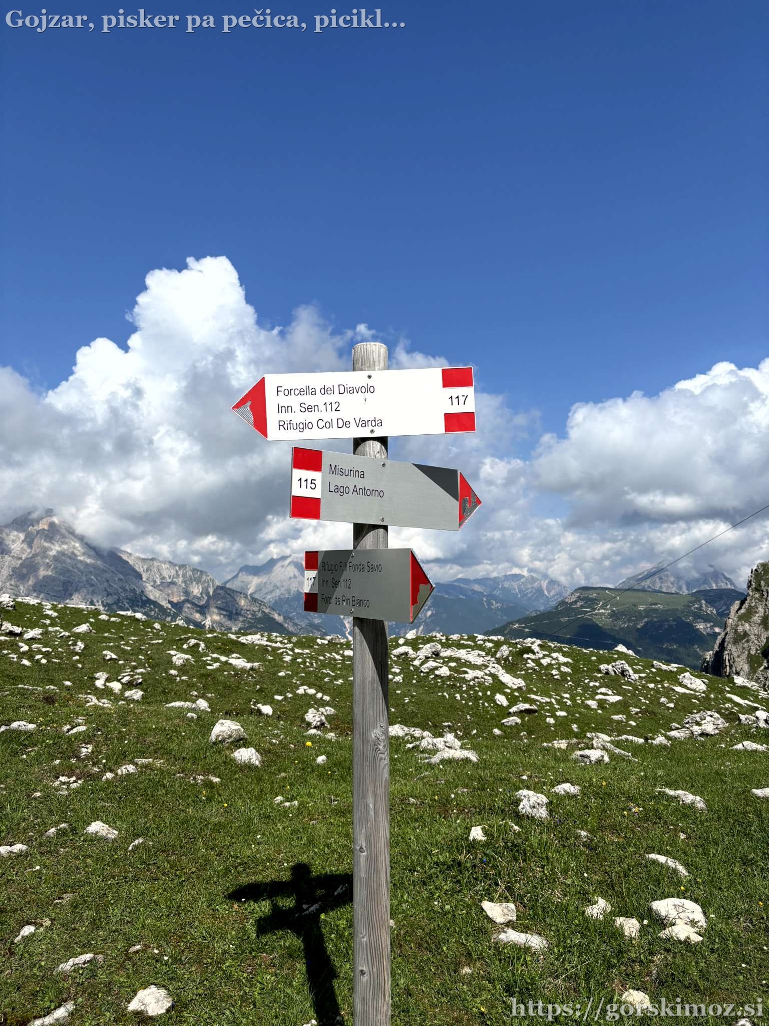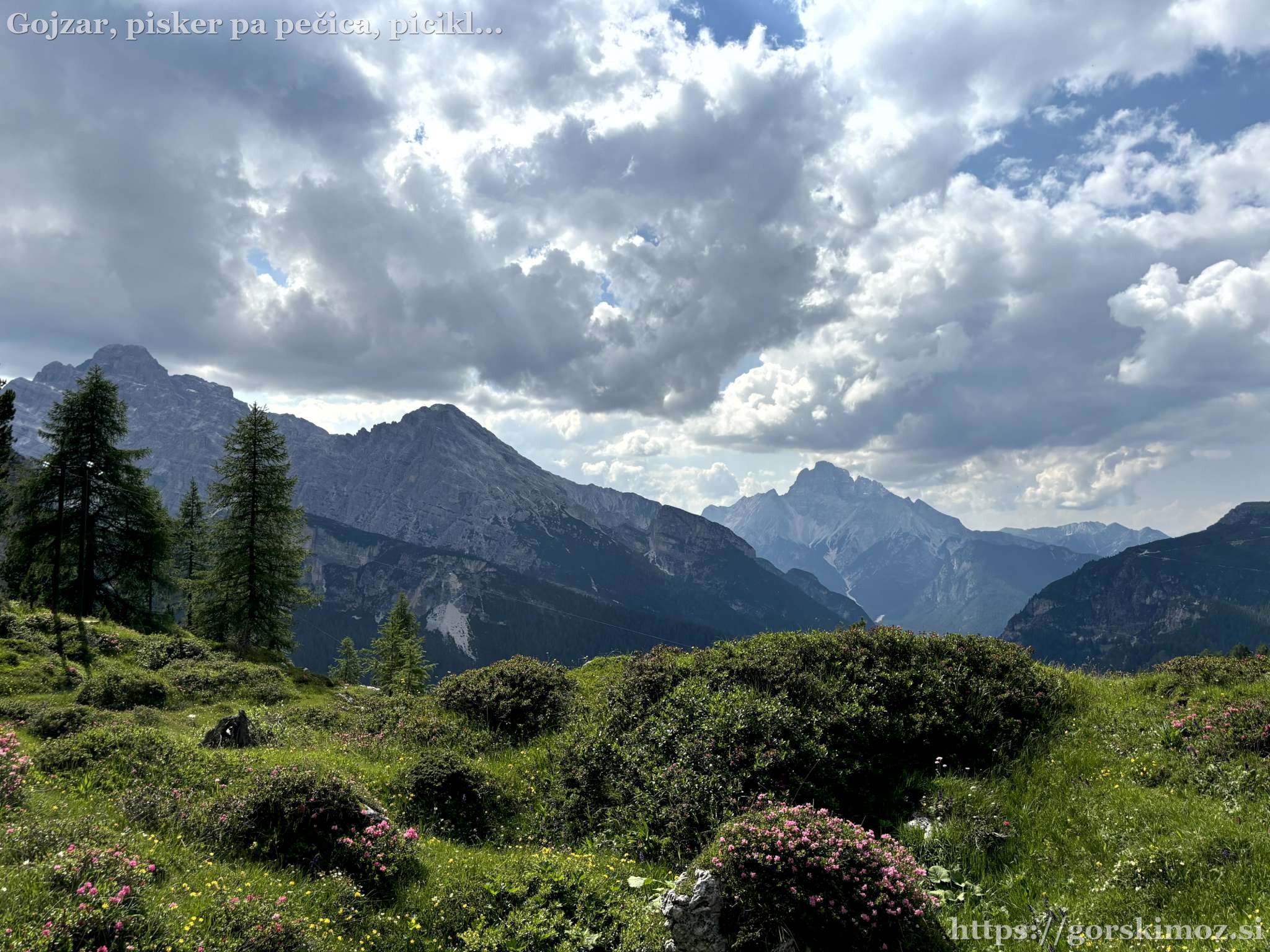 Kernerjev mak ob poti.Cvetje ob poti.Razgledi na s soncem obsijane gore ti vzamejo sapo in enostavno uživaš.Po poti se hitro spuščamo.Pogled nazaj proti koči in goram nad njo.Pogled proti dolini. V sredini Croda Rossa d’Ampezzo.Razgledi so bili prekrasni.Turška lilija ob poti.Skala ob poti proti pašnikom.Konji na paši. Prvič sem videl konje z zvonci.Košara za transport na koči Fonda Savio.Pogled nazaj na prehojeno pot.Pogled s ceste. Najvišji vrh je Punta Sorapiss.Pogled na Tri Cine z obale jezera Misurina.
