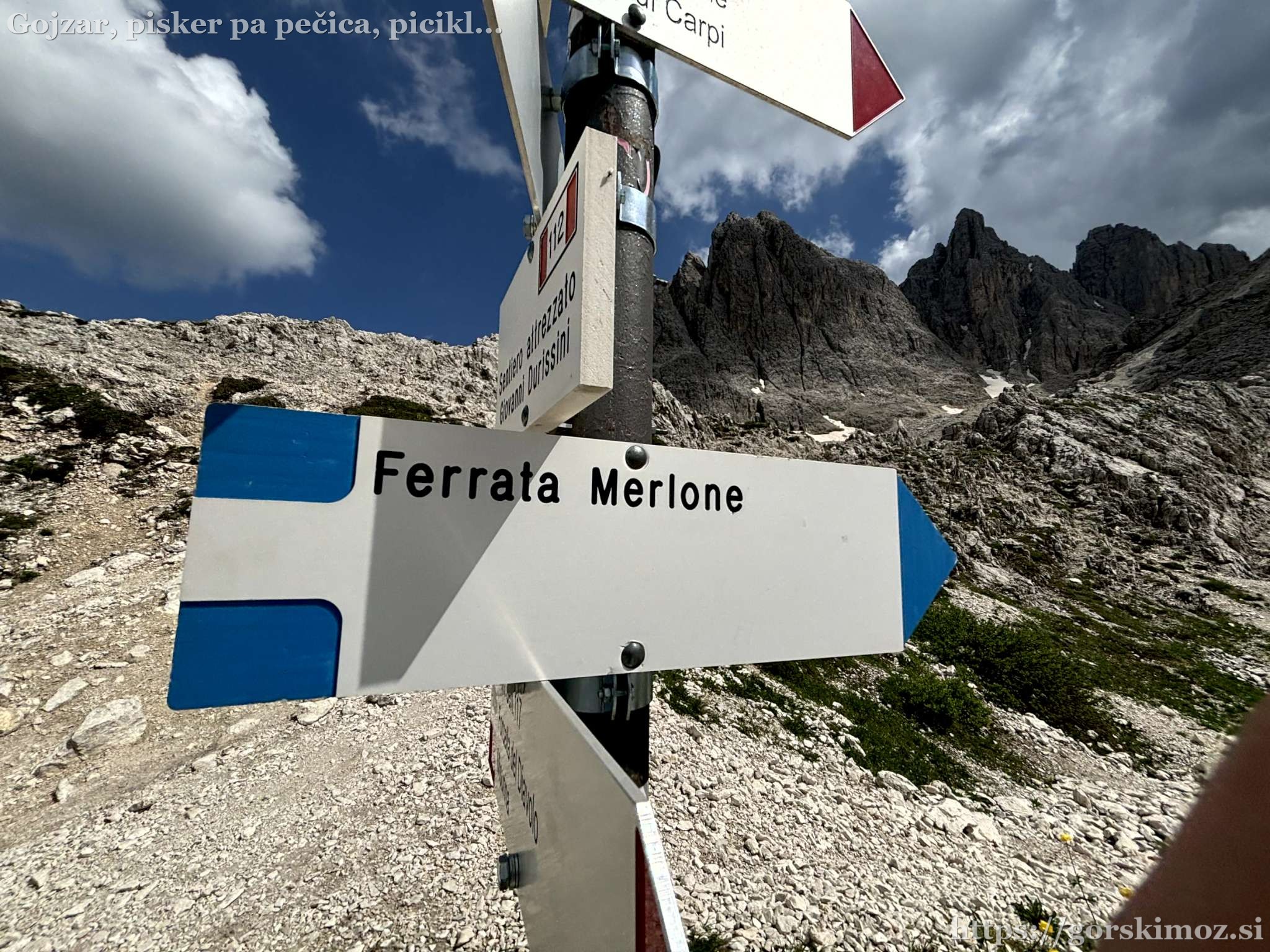 Po postanku za malico smo se odpravili proti ferati Merlone.Najprej se malo vzpnemo.Pogled nazaj proti koči in Trem Cinam v megli v ozadju.Prečenje snežišča.Spust proti snežišču pod steno, kjer se začne plezalni del poti.Nadeli smo si čelade, plezalne pasove ter samovarovalne komplete in se odpravili proti steni.Pogled nazaj.Tabla na začetku plezalnega dela.Pogled proti dolini in Trem Cinam v ozadju.Lestve so postavljene praktično navpično – pri nekaterih opisih ferate so navedene kot “Stairway to heaven”.Ko se lestve končajo, plezamo ob jeklenici.Potem spet pridemo do lestev.Pogled nazaj.Sprememba smeri na vrhu lestve.Prehod iz lestev na jeklenice. Lepo je vidno, kako navpična je stena.Zadnja jeklenica pred izstopom iz stene.Pogled na snežišča pod nami.Amfiteater.Jeklenica pod meliščem.Cik cak po melišču.Pogled nazaj.Sledi še nekaj plezanja proti vrhu.Vršni del poti.Pogled z vrha.Na vrhu – z novo tablo.Razgledi so bili fantastični.Pogled proti Trem Cinam.Začetek sestopa.Navpična jeklenica proti dolini.Sestop ob jeklenici po prvih lestvah.Sestop po lestvah je kar hiter, vseeno pa je potrebna previdnost.Lestvam (skoraj) ni videti konca.Pogled navzgor.Zadnje lestve.Pogled proti Trem Cinam in koči Fonda Savio.Na zadnjem delu sestopa nas je obsijalo sonce.Lestvam sledi še nekaj plezanja brez varoval.Še malo pa bomo na snežišču.Snežišče pod nami.Še zadnja jeklenica.Pogled na steno, ki smo jo “preplezali”.Pogled na Tri Cine s snežišča. Sneli smo čelado, samovarovalne komplete in plezalne pasove.Približane Tri Cine.Utrinek ob poti.Pogled na Cimo Cadin in steno, ki smo jo “preplezali”.Smerokaz za ferato pri koči. Pri koči se nismo predolgo zadržali, saj nas je v dolini čakali druga skupina, ki je šla samo do koče.